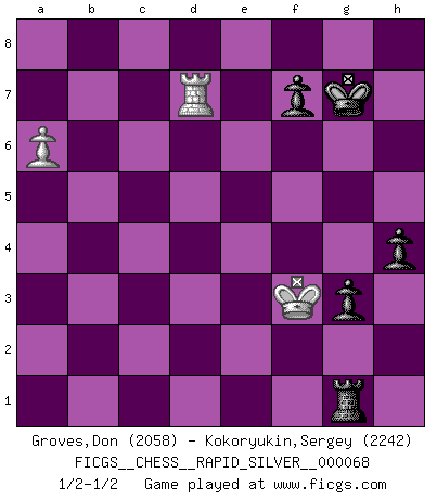 Last move : 1/2-1/2 2011 November 3 8:50:51 [Event "FICGS__CHESS__RAPID_SILVER__000068"] [Site "FICGS"] [Date "2011.08.14"] [Round "2"] [White "Groves,Don"] [Black "Kokoryukin,Sergey"] [Result "1/2-1/2"] [WhiteElo "2058"] [BlackElo "2242"] 1.e4 c5 2.Nf3 e6 3.Nc3 Nc6 4.d4 cxd4 5.Nxd4 Qc7 6.Nf3 a6 7.a4 Be7 8.e5 Nxe5 9.Nxe5 Qxe5+ 10.Qe2 Qc7 11.Qc4 Qxc4 12.Bxc4 d5 13.Bd3 Nf6 14.a5 O-O 15.O-O Bd8 16.Bd2 Bd7 17.Na4 Rc8 18.Bb4 Re8 19.c3 g6 20.Bd6 e5 21.Nc5 Rc6 22.Nxd7 Rxd6 23.Nxf6+ Bxf6 24.Rfd1 e4 25.Be2 Red8 26.f3 d4 27.cxd4 Rxd4 28.Rxd4 Rxd4 29.Kf1 Kf8 30.Ra3 Rb4 31.Bd1 Rxb2 32.fxe4 Rd2 33.Be2 Rc2 34.Ra4 Rc1+ 35.Kf2 Be5 36.h3 Bd6 37.Bc4 Bc5+ 38.Ke2 Rc2+ 39.Kd1 Rxg2 40.Bd5 Rb2 41.Kc1 Rh2 42.Bxb7 Rxh3 43.Bxa6 g5 44.Bc8 Rh1+ 45.Kd2 h5 46.a6 Rh2+ 47.Kd3 Ba7 48.Rc4 g4 49.e5 g3 50.Bb7 Ra2 51.Rc2 Ra4 52.Rc4 Ra5 53.Rc8+ Kg7 54.Rc7 Rxe5 55.Bg2 Re3+ 56.Kd2 Ra3 57.Rxa7 Ra2+ 58.Ke3 Rxg2 59.Kf3 Rg1 60.Rd7 h4 1/2-1/2 Sicilian defense Kingside Castling by player Black (move 14) Kingside Castling by player White (move 15) 10 pieces endgame at move 54 : White KRBP , Black KRBPPP WHITE : King + 1 Rook 1 Bishop 1 Pawn BLACK : King + 1 Rook 1 Bishop 3 Pawns 9 pieces endgame at move 57 : White KRBP , Black KRPPP WHITE : King + 1 Rook 1 Bishop 1 Pawn BLACK : King + 1 Rook 3 Pawns 8 pieces endgame at move 58 : White KRP , Black KRPPP WHITE : King + 1 Rook 1 Pawn BLACK : King + 1 Rook 3 Pawns This chess game ended in a draw. Follow this game move after move (download)I like to say that Bobby Fischer was the greatest player ever. But what made Fischer a genius was his ability to blend an American freshness and pragmatism with Russian ideas about strategy. (Bruce Pandolfini) Obwohl ich vom Stil her kaum zu den Priestern der Schachkunst gezählt werde, halte ich Schach doch für eine Kunst. (Tigran Petrosjan) Durante una competencia de Ajedrez, un Maestro de Ajedrez deberá ser una combinación de presa de caza y un Monge. (Alexander Alekhine) La solitude du joueur d'Echecs à l'approche du mat est semblable à celle du condamné. (Francis Szpiner) Wawaweewa ! (Borat: Cultural learnings of America for make benefit glorious nation of Kazakhstan)