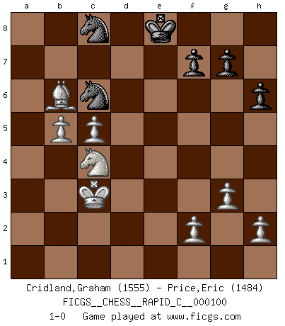 Last move : 1-0 2011 November 8 13:42:47 [Event "FICGS__CHESS__RAPID_C__000100"] [Site "FICGS"] [Date "2011.08.14"] [Round "1"] [White "Cridland,Graham"] [Black "Price,Eric"] [Result "1-0"] [WhiteElo "1555"] [BlackElo "1484"] 1.e4 e5 2.Nf3 Nc6 3.Bc4 Nf6 4.Ng5 d5 5.exd5 Na5 6.Bb5+ c6 7.dxc6 bxc6 8.Be2 h6 9.Nf3 e4 10.Ne5 Bc5 11.c3 Bd6 12.d4 exd3 13.Nxd3 Qc7 14.g3 Bh3 15.Be3 O-O 16.Nf4 Bxf4 17.Bxf4 Qd7 18.Qxd7 Nxd7 19.Nd2 Rfe8 20.Be3 Bg2 21.Rg1 Bd5 22.b3 Nb7 23.c4 Be6 24.O-O-O Bf5 25.Nf3 Ndc5 26.Kb2 Rad8 27.Rxd8 Rxd8 28.Rd1 Re8 29.Nd4 Be4 30.Bf3 Bxf3 31.Nxf3 a5 32.Kc2 Ne4 33.Nd4 Rd8 34.Nxc6 Rxd1 35.Kxd1 Nc3+ 36.Kd2 Nxa2 37.Bb6 Nb4 38.Nxa5 Nd6 39.c5 Nc8 40.Nc4 Nc6 41.Kc3 Kf8 42.b4 Ke8 43.b5 1-0 Two knights defense Kingside Castling by player Black (move 15) Queenside Castling by player White (move 24) Player White won this chess game. Follow this game move after move (download)During a Chess competition a Chessmaster should be a combination of a beast of prey and a monk. (Alexander Alekhine) Ich verachte Kasparow. (Viktor Kortschnoi) Bobby es la celebridad menos entendida y malinterpretada que camina el la faz de esta tierra. (Yasser Seirawan) Ce qui caractérise les parties de combat, c'est que si le défenseur a constamment de difficiles problèmes à résoudre, l'attaquant doit chercher sans relâche de nouvelles possibilités d'attaque. (Koblentz) The next best thing to gambling and winning is gambling and loosing. (Nick Dandalos)