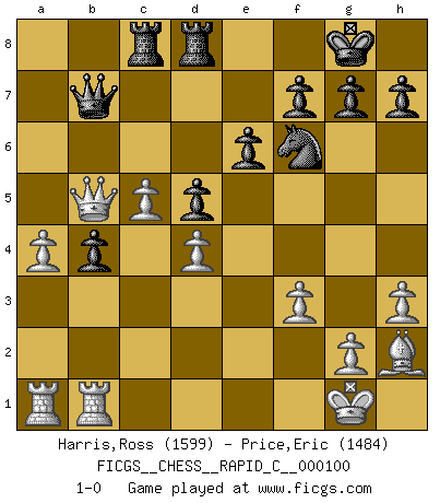 Last move : 1-0 2011 September 15 0:6:37 [Event "FICGS__CHESS__RAPID_C__000100"] [Site "FICGS"] [Date "2011.08.14"] [Round "1"] [White "Harris,Ross"] [Black "Price,Eric"] [Result "1-0"] [WhiteElo "1599"] [BlackElo "1484"] 1.d4 Nf6 2.Nf3 e6 3.Bf4 Be7 4.h3 c5 5.e3 Nc6 6.c3 b6 7.Bd3 Bb7 8.Nbd2 Rc8 9.O-O O-O 10.Qe2 d6 11.Rad1 Qc7 12.Bh2 Qb8 13.a4 Qa8 14.Ba6 cxd4 15.exd4 Na5 16.Bxb7 Nxb7 17.Nc4 d5 18.Nce5 Nd6 19.Nd2 Qb7 20.Ra1 a6 21.Rfc1 b5 22.Nd3 Nfe4 23.Nxe4 Nxe4 24.f3 Nf6 25.b4 Rfd8 26.Nc5 Bxc5 27.bxc5 b4 28.Rcb1 a5 29.cxb4 axb4 30.Qb5 1-0 Queen's pawn game Kingside Castling by player White (move 9) Kingside Castling by player Black (move 9) Player White won this chess game. Follow this game move after move (download)The game of Chess is not merely an idle amusement; several very valuable qualities of the mind are to be acquired and strengthened by it, so as to become habits ready on all occasions; for life is a kind of Chess. (Benjamin Franklin) Obendrein hat der FIDE-Präsident den Revolutionsführer Gaddafi zum »Großmeister« ernannt, am Ende der WM. Das ist lächerlich! (Joel Lautier) Dios mío, Bobby Fischer juega tan simple. (Alexei Suetin) Il (Jacob Murray) ne joue pas pour le bon coup, mais pour le meilleur. (Eloi Relange) I just play for fun. (Anna Kournikova)