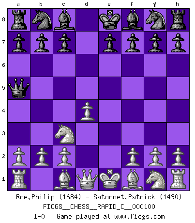 Last move : 1-0 2011 September 19 22:33:0 [Event "FICGS__CHESS__RAPID_C__000100"] [Site "FICGS"] [Date "2011.08.14"] [Round "1"] [White "Roe,Philip"] [Black "Satonnet,Patrick"] [Result "1-0"] [WhiteElo "1684"] [BlackElo "1490"] 1.e4 d5 2.exd5 Qxd5 3.Nc3 Qa5 4.d4 1-0 This chess game has been lost on time (started : 2011.08.14 14:12:26) Scandinavian (centre counter) defense Player White won this chess game. Follow this game move after move (download)Chess is a terrible game. If you have no center, your opponent has a freer position. If you do have a center, then you really have something to worry about ! (Siegbert Tarrasch) Stelle das Brett so, daß die Sonne in die Augen deines Gegners scheint. (Ruy López) Yo tuve un dolor de muelas en la primer partida. En el segundo juego, tuve un dolor de cabeza. En el tercero, tuve un ataque de reumatísmo. En la cuarta partida, no me sentía muy bien. ¿Y en el quinto juego? Bueno, ¿que acaso uno tiene que ganar todos los juegos?. (Siegbert Tarrasch) Le joueur d'Echecs qui veut atteindre le top est obligé de développer son propre credo créatif. Alexeï Stepanovicth Souétine. Il est facile d'écrire des livres ! Ce qui est difficile, c'est de jouer ! (Alexeï Stepanovicth Souétine) The only difference between a tax man and a taxidermist is that the taxidermist leaves the skin. (Mark Twain)