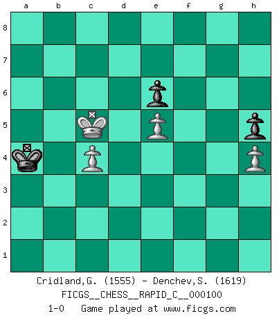 Last move : 1-0 2011 December 20 9:10:49 [Event "FICGS__CHESS__RAPID_C__000100"] [Site "FICGS"] [Date "2011.08.14"] [Round "1"] [White "Cridland,Graham"] [Black "Denchev,Stanimir"] [Result "1-0"] [WhiteElo "1555"] [BlackElo "1619"] 1.e4 c5 2.Nf3 e6 3.d4 Nf6 4.Nc3 d5 5.exd5 exd5 6.Bg5 Be7 7.Be2 Be6 8.O-O Nbd7 9.Re1 O-O 10.dxc5 Nxc5 11.Nd4 Nce4 12.Nxe4 Nxe4 13.Nxe6 fxe6 14.Bxe7 Qxe7 15.Bf3 Qc5 16.Qe2 Rae8 17.Bxe4 dxe4 18.Rad1 Rf6 19.Rd2 Ref8 20.Qe3 Qxe3 21.Rxe3 Rf4 22.g3 R4f6 23.Rxe4 Rc8 24.c3 Rc7 25.Rd6 Kf7 26.Red4 Ke7 27.Kg2 Rf5 28.Rd2 Ra5 29.a3 Rf5 30.R6d3 Rf8 31.Rf3 Rf5 32.Re3 Rd7 33.Rxd7+ Kxd7 34.Rd3+ Ke7 35.Kf1 Rb5 36.Rd2 a5 37.a4 Rc5 38.Ke2 Rc4 39.Rd4 Rc5 40.Kf3 Rf5+ 41.Ke3 Re5+ 42.Kd2 Rf5 43.f4 Rh5 44.h4 h6 45.Re4 Rd5+ 46.Ke2 g5 47.Re5 Rxe5+ 48.fxe5 gxh4 49.gxh4 Kd7 50.Kd3 Kc6 51.Kc4 h5 52.b4 b6 53.Kd4 b5 54.axb5+ Kxb5 55.bxa5 Kxa5 56.Kc5 Ka4 57.c4 1-0 Sicilian defense Kingside Castling by player White (move 8) Kingside Castling by player Black (move 9) 10 pieces endgame at move 54 : White KPPPPP , Black KPPP WHITE : King + 5 Pawns BLACK : King + 3 Pawns 9 pieces endgame at move 54 : White KPPPP , Black KPPP WHITE : King + 4 Pawns BLACK : King + 3 Pawns 8 pieces endgame at move 55 : White KPPPP , Black KPP WHITE : King + 4 Pawns BLACK : King + 2 Pawns 7 pieces endgame at move 55 : White KPPP , Black KPP WHITE : King + 3 Pawns BLACK : King + 2 Pawns Player White won this chess game. Follow this game move after move (download)We must make sure that Chess will not be like a dead language, very interesting, but for a very small group. (Sytze Faber) Drei Punkte vor allen anderen ist wie einer, der im weißen Anzug posiert, während der Rest in Müllsäcke gekleidet dasteht. (Viktor Kortschnoi) Todo lo que importa ante el tablero de Ajedrez son buenas jugadas. (Bobby Fischer) Il n'y a pas eu de défaite parce que je ne crois pas que cet ordinateur ait jamais existé. IBM a triché en refusant d'imprimer les modes de recherche de la machine. C'est évident, pendant le match, des coups décisifs ont été joués par des êtres humains. Aujourd'hui, les meilleurs spécialistes en informatique ne peuvent toujours pas expliquer comment Deep-Blue a pu jouer contre la logique des ordinateurs. IBM a gagné une guerre de communication, mais ils sont incapables de prouver que l'ordinateur a gagné tout seul. (Garry Kasparov) The smarter you play, the luckier you'll be. (Mark Pilarski)