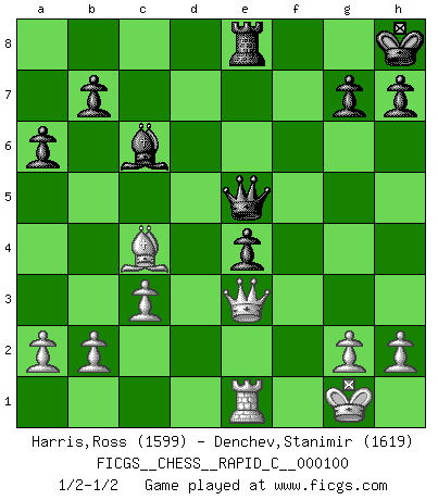 Last move : 1/2-1/2 2011 September 30 9:40:3 [Event "FICGS__CHESS__RAPID_C__000100"] [Site "FICGS"] [Date "2011.08.14"] [Round "1"] [White "Harris,Ross"] [Black "Denchev,Stanimir"] [Result "1/2-1/2"] [WhiteElo "1599"] [BlackElo "1619"] 1.d4 d5 2.Nf3 Nf6 3.Bf4 e6 4.e3 Bd6 5.Bg3 O-O 6.Bd3 c5 7.c3 Nc6 8.Nbd2 a6 9.Ne5 Bxe5 10.dxe5 Nd7 11.f4 f6 12.Bh4 Qe8 13.exf6 Nxf6 14.O-O Bd7 15.Qc2 Qh5 16.Nf3 Rae8 17.Bg3 Ng4 18.Rae1 e5 19.fxe5 Ncxe5 20.Nxe5 Rxf1+ 21.Bxf1 Nxe5 22.Qb3 Bc6 23.e4 c4 24.Qb6 dxe4 25.Bxe5 Qxe5 26.Bxc4+ Kh8 27.Qe3 1/2-1/2 Queen's Bishop game Kingside Castling by player Black (move 5) Kingside Castling by player White (move 14) This chess game ended in a draw. Follow this game move after move (download)A bad day of Chess is better than any good day at work. (Anonymous) Bis jetzt ist Weiß einer wohlbekannten Analyse gefolgt. Aber jetzt begeht er einen schrecklichen Fehler: Er beginnt seinen eigenen Kopf zu benutzen. (Siegbert Tarrasch) Un mal día en el Ajedrez, es mejor que cualquier buen día en el trabajo. (Anonymous) Les échecs sont utiles à l'exercice de la faculté de penser et à celle de l'imagination. Car nous devons posséder une méthode élaborée pour atteindre des buts partout où nous devons conduire notre raison. (Leibnitz) There is a very easy way to return from a casino with a small fortune : go there with a large one. (Jack Yelton)