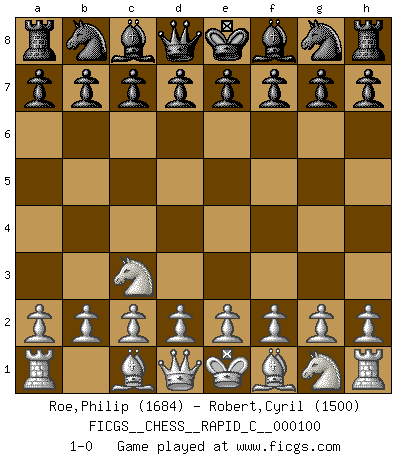 Last move : 1-0 2011 September 13 22:20:9 [Event "FICGS__CHESS__RAPID_C__000100"] [Site "FICGS"] [Date "2011.08.14"] [Round "1"] [White "Roe,Philip"] [Black "Robert,Cyril"] [Result "1-0"] [WhiteElo "1684"] [BlackElo "1500"] 1.Nc3 1-0 This chess game has been lost on time (started : 2011.08.14 14:12:26) Dunst (Sleipner, Heinrichsen) Opening Player White won this chess game. Follow this game move after move (download)Suddenly it was obvious to me in my analysis I had missed what Fischer had found with the greatest of ease at the board. (Mikhail Botvinnik) Intelligenz läßt sich nicht am Weg, sondern nur am Ergebnis feststellen. (Garry Kasparov) EL Ajedrez es como la vida. (Boris Spassky) Dieu déplace le joueur, et celui-ci la pièce. Quel Dieu derrière Dieu commence donc la trame ? Arturo Perez-Reverte (prix de littérature policière 1993). A bird doesn't sing because it has an answer, it sings because it has a song. (Maya Angelou)