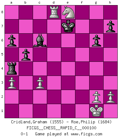Last move : 0-1 2011 November 4 0:23:1 [Event "FICGS__CHESS__RAPID_C__000100"] [Site "FICGS"] [Date "2011.08.14"] [Round "1"] [White "Cridland,Graham"] [Black "Roe,Philip"] [Result "0-1"] [WhiteElo "1555"] [BlackElo "1684"] 1.e4 c5 2.Nf3 e6 3.d4 cxd4 4.Nxd4 a6 5.Nc3 b5 6.Bd3 Bb7 7.O-O Bc5 8.Nb3 Be7 9.Kh1 d6 10.f4 Nf6 11.a3 Nbd7 12.Qe2 Qc7 13.Bd2 O-O 14.Rae1 Nc5 15.Rf3 Rfd8 16.Rh3 Nxd3 17.cxd3 e5 18.d4 exd4 19.Nxd4 Qc4 20.Qe3 Ng4 21.Qg1 Bf6 22.Nf3 Qc5 23.Be3 Nxe3 24.Qxe3 Bxc3 25.Qxc3 Qxc3 26.bxc3 Rac8 27.Nd4 Rc4 28.Rg3 g6 29.e5 dxe5 30.fxe5 Rdc8 31.Nf5 R8c7 32.Nd6 Ra4 33.Ra1 Bd5 34.Kg1 Re7 35.Re3 f6 36.Nc8 Re6 37.Rd1 Bc6 38.Rd8+ Kf7 39.Nd6+ Ke7 40.exf6+ Kxf6 41.Rxe6+ Kxe6 42.Ne8 Ke7 0-1 Sicilian : Kan, 5.Nc3 Kingside Castling by player White (move 7) Kingside Castling by player Black (move 13) Player Black won this chess game. Follow this game move after move (download)In blitz, the Knight is stronger than the Bishop. (Vlastimil Hort) Ich spiele ehrlich und spiele, um zu gewinnen. Wenn ich verliere nehme ich meine Medizin. (Robert James Fischer) Los tropiezos estan todos ahí en el tablero, esperando que se cometan. (Savielly Tartakover) Des idées, des idées, j'en ai cent, j'en ai mille. Des bonnes, des mauvaises, applicables, irréalisables... Il suffit de faire le tri ! (Roos) Life is pain my dear and anyone who says otherwise is selling something. (Princess Bride)