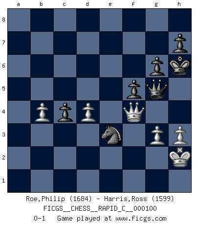 Last move : 0-1 2011 October 13 14:52:30 [Event "FICGS__CHESS__RAPID_C__000100"] [Site "FICGS"] [Date "2011.08.14"] [Round "1"] [White "Roe,Philip"] [Black "Harris,Ross"] [Result "0-1"] [WhiteElo "1684"] [BlackElo "1599"] 1.e4 c6 2.Nc3 d5 3.Nf3 dxe4 4.Nxe4 Nf6 5.Nxf6+ exf6 6.d4 Bd6 7.Bd3 O-O 8.O-O Bg4 9.h3 Bh5 10.Re1 Nd7 11.c3 Qc7 12.Be3 Rfe8 13.Be2 Rad8 14.Nh4 Bxe2 15.Qxe2 g6 16.Nf3 c5 17.Rad1 c4 18.Qc2 b5 19.a4 a6 20.Bd2 Nb6 21.axb5 axb5 22.Re4 Rxe4 23.Qxe4 Nd5 24.Bh6 Bf4 25.Bxf4 Nxf4 26.Ra1 Nd3 27.b4 Nf4 28.g3 Nd5 29.Qc2 Qc6 30.Nh2 Ra8 31.Rxa8+ Qxa8 32.Ng4 Qa1+ 33.Kh2 f5 34.Nh6+ Kf8 35.Qe2 Qxc3 36.Qe5 Qf3 37.Qh8+ Ke7 38.Qe5+ Kd7 39.Nxf7 Qxf2+ 40.Kh1 Qf3+ 41.Kh2 Ne3 42.Qxb5+ Ke7 43.Qe5+ Kxf7 44.Qc7+ Kf8 45.Qd8+ Kg7 46.Qe7+ Kh6 47.Qh4+ Qh5 48.Qf4+ Qg5 0-1 Caro-Kann : Two knights variation Kingside Castling by player Black (move 7) Kingside Castling by player White (move 8) Player Black won this chess game. Follow this game move after move (download)A bad plan is better than none at all. (Frank Marshall) Oft bringt ein stiller Zug das Erdbeben. (Richard Reti) Tu no necesitas jugar muy bien, únicamente ayudar a tu oponenet a que juegue muy mal. (Genrikh Chepukaitis) C'est la seule position que je connaisse où les deux camps sont mals. Propos prêtés à V. Anand. Depression is just anger without enthusiasm. (Unknown)