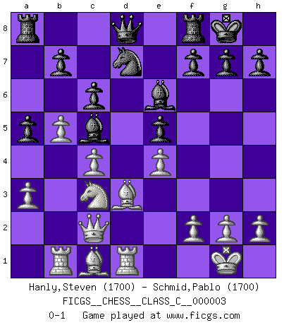Last move : 0-1 2006 November 27 22:7:2 [Event "FICGS__CHESS__CLASS_C__000003"] [Site "FICGS"] [Date "2006.05.06"] [Round "1"] [White "Hanly,Steven"] [Black "Schmid,Pablo"] [Result "0-1"] [WhiteElo "1700"] [BlackElo "1700"] 1.e4 c5 2.Nf3 e6 3.d4 cxd4 4.Nxd4 a6 5.c4 Nf6 6.Nc3 Bb4 7.Bd3 Nc6 8.Nxc6 dxc6 9.O-O e5 10.Qc2 O-O 11.a3 Be7 12.b4 a5 13.b5 Be6 14.Rb1 Nd7 15.Rd1 Bc5 0-1 This chess game has been lost on time (started : 2006.05.06 12:23:53) Sicilian : Kan, Maroczy bind (Reti variation) Kingside Castling by player White (move 9) Kingside Castling by player Black (move 10) Player Black won this chess game. Follow this game move after move (download)I like to say that Bobby Fischer was the greatest player ever. But what made Fischer a genius was his ability to blend an American freshness and pragmatism with Russian ideas about strategy. (Bruce Pandolfini) Gott hat gewollt, dass ich Champion werde. (Surab Azmajparaschvili) Durante una competencia de Ajedrez, un Maestro de Ajedrez deberá ser una combinación de presa de caza y un Monge. (Alexander Alekhine) Des idées, des idées, j'en ai cent, j'en ai mille. Des bonnes, des mauvaises, applicables, irréalisables... Il suffit de faire le tri ! (Roos) Experiences are the keys to life. (Daniel Parmet)