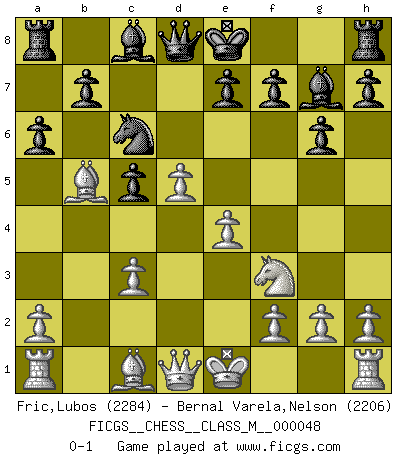 Last move : 0-1 2011 October 30 11:41:59 [Event "FICGS__CHESS__CLASS_M__000048"] [Site "FICGS"] [Date "2011.08.15"] [Round "1"] [White "Fric,Lubos"] [Black "Bernal Varela,Nelson"] [Result "0-1"] [WhiteElo "2284"] [BlackElo "2206"] 1.Nf3 Nf6 2.c4 g6 3.d4 Bg7 4.Nc3 d5 5.cxd5 Nxd5 6.e4 Nxc3 7.bxc3 c5 8.Bb5+ Nc6 9.d5 a6 0-1 Reti Opening Player Black won this chess game. Follow this game move after move (download)Via the squares on the chessboard, the Indians explain the movement of time and the age, the higher influences which control the world and the ties which link Chess with the human soul. (Al-Masudi) Moralische Siege zählen nicht. (Savielly Grigorievitsch Tartakower) Cuando me preguntan: -¿Cual es el secreto que te hace hacer mejores movidas que tus oponentes?, Yo respondo: Me da gusto que me pregunten eso, porque, como veran, hay una simple razón. Yo pienso mis propias movidas y dejo a mi oponente que el piense las suyas. (Alexander Alekhine) Les Echecs, c'est l'art de la guerre sans les charniers, c'est la résurrection des morts tombés au champ d'honneur, l'espoir perpétuel, la suprématie de l'intelligence sur la force, la culture de l'esprit. (F. Szpiner) Lamb in skin of tiger, still fears the wolf. (Chinese proverb)