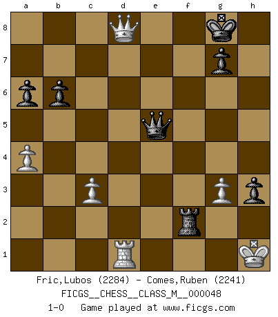 Last move : 1-0 2013 January 15 12:21:26 [Event "FICGS__CHESS__CLASS_M__000048"] [Site "FICGS"] [Date "2011.08.15"] [Round "1"] [White "Fric,Lubos"] [Black "Comes,Ruben"] [Result "1-0"] [WhiteElo "2284"] [BlackElo "2241"] 1.e4 c5 2.Nf3 d6 3.d4 cxd4 4.Nxd4 Nf6 5.Nc3 a6 6.Be3 e5 7.Nb3 Be6 8.Nd2 Nbd7 9.Bc4 Be7 10.O-O O-O 11.a4 Rc8 12.Qe2 Qc7 13.Ba2 Bxa2 14.Rxa2 d5 15.exd5 Bb4 16.Ndb1 Nb6 17.Bxb6 Qxb6 18.Qxe5 Rfe8 19.Qf4 Rcd8 20.g3 Qc5 21.Ra1 h5 22.Rd1 Rd6 23.Rf1 b6 24.Qf3 Qc8 25.Rd1 Ng4 26.Ne4 Rxe4 27.Qxe4 Bc5 28.Rf1 Nxf2 29.Rxf2 Rf6 30.b4 Bxf2+ 31.Kg2 h4 32.Nd2 h3+ 33.Kh1 Qc3 34.Rd1 Bd4 35.Nb1 Qxb4 36.Qe8+ Qf8 37.Qe4 Bc5 38.Nd2 Rf2 39.Qd3 f5 40.Nf3 Qf6 41.c3 Qg6 42.Ne5 Qe8 43.Nf3 Qh5 44.Ne5 f4 45.d6 fxg3 46.hxg3 Qxe5 47.d7 Be7 48.d8R+ Bxd8 49.Qxd8+ 1-0 This chess game has been lost on time (started : 2011.08.15 12:27:36) Sicilian : Najdorf, Byrne (English) attack Kingside Castling by player White (move 10) Kingside Castling by player Black (move 10) Promotion Rook by player White (move 48) Player White won this chess game. Follow this game move after move (download)In order to improve your game, you must study the endgame before everything else, for whereas the endings can be studied and mastered by themselves, the middle game and the opening must be studied in relation to the endgame. (Jose Raul Capablanca) Ohne Fehler kann es keine Brillanz geben. (Emanuel Lasker) Uno por uno, yo los acribillé, mi superioridad muy pronto se volvio aparente. (Jose Capablanca) Il n'y a plus de joueurs du niveau de Jacob Murray dont la seule quête est le beau jeu, le plaisir de voir les pièces construire quelque chose. Sur 10 idées à la minute, 9 seront sans intérêt, la dernière s'avèrera géniale. (Christian Bauer) He who defends everything defends nothing. (Frederick the Great)
