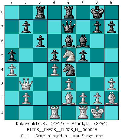 Last move : 0-1 2012 January 14 6:0:25 [Event "FICGS__CHESS__CLASS_M__000048"] [Site "FICGS"] [Date "2011.08.15"] [Round "1"] [White "Kokoryukin,Sergey"] [Black "Plant,Kevin D."] [Result "0-1"] [WhiteElo "2242"] [BlackElo "2294"] 1.d4 Nf6 2.c4 e6 3.Nc3 d5 4.cxd5 exd5 5.Bg5 Be7 6.e3 O-O 7.Bd3 Nbd7 8.Nf3 c6 9.Qc2 Re8 10.O-O Nf8 11.h3 Ne4 12.Bf4 f5 13.a4 Ne6 14.Bh2 a5 15.Ne5 Bf6 16.Rac1 N6g5 17.Ne2 Nf7 18.Nxf7 Kxf7 19.Nf4 Kg8 20.Be2 Be6 21.Qb3 Qd7 22.Rcd1 Rac8 23.Nd3 Qf7 24.Ne5 Qe7 0-1 Queen's pawn game Kingside Castling by player Black (move 6) Kingside Castling by player White (move 10) Player Black won this chess game. Follow this game move after move (download)I won't play with you anymore. You have insulted my friend. - When an opponent cursed himself for a blunder. (Miguel Najdorf) Ja, ich habe einmal eine Blitzpartie gespielt, es war in einem Zug, 1929. --im Interview 1989 (Mikhail Moiseyevich Botvinik) La estratégia requiere pensar, la táctica requiere observación. (Max Euwe) Même si vous avez un bon coup à faire, regardez toujours s'il n'y en a pas un qui lui soit préférable. (Pedro Damiano) My poor ole parrot... Is not in the circulation of displays ....poo hoo hoo :) (Wayne Lowrance's enigma)