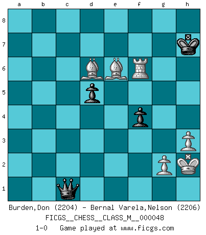 Last move : 1-0 2012 April 2 4:57:46 [Event "FICGS__CHESS__CLASS_M__000048"] [Site "FICGS"] [Date "2011.08.15"] [Round "1"] [White "Burden,Don"] [Black "Bernal Varela,Nelson"] [Result "1-0"] [WhiteElo "2204"] [BlackElo "2206"] 1.d4 Nf6 2.c4 g6 3.Nc3 d5 4.Nf3 Bg7 5.Qb3 dxc4 6.Qxc4 O-O 7.e4 b6 8.e5 Be6 9.exf6 Bxc4 10.fxg7 Kxg7 11.Bxc4 c6 12.Bf4 b5 13.Bb3 Na6 14.O-O Nb4 15.Rfd1 Nd5 16.Nxd5 cxd5 17.Rac1 Rc8 18.Rc5 Rxc5 19.dxc5 e6 20.Nd4 Qd7 21.Be5+ f6 22.Bd6 Re8 23.f4 h6 24.Re1 a6 25.Bc2 Kh7 26.h3 Kg7 27.b4 h5 28.Re3 h4 29.Re1 Kf7 30.Kf2 Qb7 31.a4 Qd7 32.axb5 axb5 33.Bd3 Qa7 34.Bxb5 Ra8 35.Rxe6 Qa3 36.Re7+ Kg8 37.Nf3 Qb2+ 38.Kg1 Ra2 39.Be2 Qxb4 40.Kh2 Ra3 41.Nxh4 Qe1 42.Nf3 Qc1 43.c6 Rxf3 44.c7 Rc3 45.Bg4 g5 46.Be6+ Kh8 47.Re8+ Kh7 48.c8Q Rxc8 49.Rxc8 Qe3 50.Re8 Qc1 51.Rf8 gxf4 52.Rxf6 1-0 King's Indian defense, 3.Nc3 Kingside Castling by player Black (move 6) Kingside Castling by player White (move 14) Promotion Queen by player White (move 48) 10 pieces endgame at move 52 : White KRBBPP , Black KQPP WHITE : King + 1 Rook 2 Bishops 2 Pawns BLACK : King + 1 Queen 2 Pawns Player White won this chess game. Follow this game move after move (download)Chess is like war on a board. (Bobby Fischer) Du kannst im Schach nur gut werden, wenn du das Spiel liebst. (Robert James Fischer) Observen a Garry Kasparov. Después de una derrota, invariablemente el gana la próxima partida. Prácticamente hace pedazos a su siguiente oponente. Eso es algo que tenemos que aprender a lograr. (Maurice Ashley) Le plus grand jeu de l'esprit jamais inventé, plus vous l'apprenez, plus vous y prenez du plaisir. (Garry Kasparov) I couldn't make any sense out of what this particular thread is about. It sounds like R2 D2 computer speaking. A space fight ?!? Some 'command' problems in Moscow ? Some killers & narcotic addicts attacking some game & a god wannabe ?? (Dinesh De Silva, lost in a russian conflict in FICGS forum)