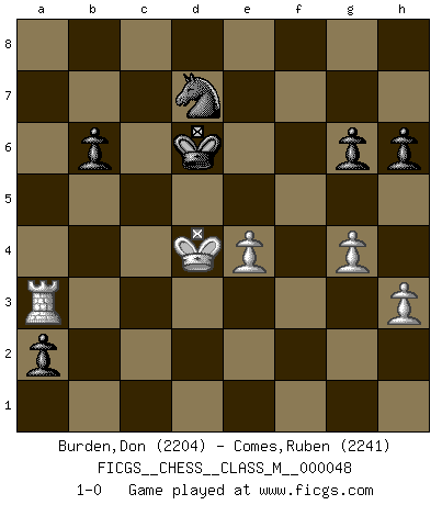 Last move : 1-0 2013 January 16 0:30:35 [Event "FICGS__CHESS__CLASS_M__000048"] [Site "FICGS"] [Date "2011.08.15"] [Round "1"] [White "Burden,Don"] [Black "Comes,Ruben"] [Result "1-0"] [WhiteElo "2204"] [BlackElo "2241"] 1.d4 d5 2.Nf3 Nf6 3.c4 e6 4.g3 dxc4 5.Bg2 a6 6.Ne5 Bb4+ 7.Nc3 Nd5 8.Bd2 Nb6 9.e3 N8d7 10.Nxd7 Qxd7 11.Ne4 Be7 12.O-O O-O 13.Qc2 Nd5 14.Qxc4 b6 15.Rfd1 a5 16.Nc3 Rd8 17.Rac1 Ba6 18.Qb3 Rac8 19.e4 Nb4 20.Be3 Rb8 21.Bh3 Nd3 22.Rb1 c5 23.d5 c4 24.Qc2 Bf6 25.a4 Kh8 26.b3 Nb4 27.Qd2 Qd6 28.Bf1 cxb3 29.Bxa6 Nxa6 30.Nb5 Qe5 31.Bf4 Qxe4 32.Bxb8 Nxb8 33.Qe3 Qxe3 34.fxe3 b2 35.dxe6 Rxd1+ 36.Rxd1 fxe6 37.Rb1 Nd7 38.Nd4 Nc5 39.Rxb2 Nxa4 40.Rb5 e5 41.Nf5 Kg8 42.Nd6 Kf8 43.Nc4 Bd8 44.Rd5 Ke7 45.Rxe5+ Kd7 46.Rd5+ Ke7 47.Na3 Bc7 48.Nb5 Bb8 49.Kf2 Nc5 50.Ke2 g6 51.Kd2 Nd7 52.Kc3 Nf6 53.Rd1 Be5+ 54.Kd3 Ke6 55.e4 Ng4 56.Rd2 Ke7 57.Re2 Ke6 58.Nd4+ Kd6 59.Rc2 Bxd4 60.Kxd4 Ne5 61.Rb2 Nd7 62.g4 h6 63.Rb3 Ke6 64.Rb5 a4 65.Rb4 a3 66.h3 Kd6 67.Rb3 a2 68.Ra3 1-0 This chess game has been lost on time (started : 2011.08.15 12:27:36) Queen's pawn game Kingside Castling by player White (move 12) Kingside Castling by player Black (move 12) Player White won this chess game. Follow this game move after move (download)Fischer Chess play was always razor-sharp, rational and brilliant. One of the best ever. (Dave Regis) Verschiedene, sehr schätzbare und im Laufe des Lebens nützliche Eigenschaften des Geistes können durch das Schachspiel erworben und gekräftigt werden, so dass sie zu Gewohnheiten werden, die uns nie im Stich lassen. (Benjamin Franklin) Los libros de Ajedrez deben de usarse igual como usamos los anteojos: para mejorar la vista, aunque algunos jugadores los quieren usar como si ellos les otorgaran la vision. (José Raúl Capablanca) Les échecs sont utiles à l'exercice de la faculté de penser et à celle de l'imagination. Car nous devons posséder une méthode élaborée pour atteindre des buts partout où nous devons conduire notre raison. (Leibnitz) I've lost money so fast in these clubs it's left me reeling. I've read every poker book ever written, but the only way to get better at the game is to go out and play with people who are really good. The problem is, you stand to lose a lot of money doing it. (Matt Damon)