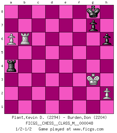 Last move : 1/2-1/2 2012 May 8 12:37:18 [Event "FICGS__CHESS__CLASS_M__000048"] [Site "FICGS"] [Date "2011.08.15"] [Round "1"] [White "Plant,Kevin D."] [Black "Burden,Don"] [Result "1/2-1/2"] [WhiteElo "2294"] [BlackElo "2204"] 1.e4 c5 2.Nf3 d6 3.d4 cxd4 4.Nxd4 Nf6 5.Nc3 a6 6.Bg5 Nbd7 7.Bc4 e6 8.O-O Qb6 9.Bb3 Be7 10.a4 Qa5 11.f4 O-O 12.Kh1 h6 13.Bh4 Nc5 14.Ba2 Kh8 15.e5 dxe5 16.fxe5 Ng8 17.Be1 Qc7 18.a5 Qxe5 19.Bg3 Qg5 20.b4 Nd7 21.Ne4 Qg6 22.Nd6 Bxd6 23.Bxd6 Re8 24.Qe2 Nf8 25.c3 e5 26.Bxf8 Bg4 27.Bxf7 Bxe2 28.Bxg6 Bxf1 29.Bxe8 Bxg2+ 30.Kxg2 exd4 31.Bh5 Rxf8 32.cxd4 Rd8 33.Bf3 Rd7 34.Rc1 Ne7 35.Rc5 Nc6 36.Bxc6 bxc6 37.Rxc6 Rxd4 38.Rxa6 Rxb4 39.Rb6 Ra4 40.a6 Kg8 41.Kg3 1/2-1/2 Sicilian : Najdorf, 6.Bg5 Kingside Castling by player White (move 8) Kingside Castling by player Black (move 11) 10 pieces endgame at move 37 : White KRPPP , Black KRPPP WHITE : King + 1 Rook 3 Pawns BLACK : King + 1 Rook 3 Pawns 9 pieces endgame at move 38 : White KRPPP , Black KRPP WHITE : King + 1 Rook 3 Pawns BLACK : King + 1 Rook 2 Pawns 8 pieces endgame at move 38 : White KRPP , Black KRPP WHITE : King + 1 Rook 2 Pawns BLACK : King + 1 Rook 2 Pawns This chess game ended in a draw. Follow this game move after move (download)I am the best player in the world and I am here to prove it. (Bobby Fischer) Im Fernschach kannst du während dem Spiel rauchen. (John Christen Knudsen) La única cosa que los jugadores de Ajedrez tienen en común, es el Ajedrez. (Lodewijk Prins) Les réformistes prétendent que les progrès de la théorie conduiront à la disparition des échecs, et qu'il faut, pour leur rendre vie, en remanier les règles. En réalité, qu'exprime cette affirmation? Le mépris de l'intuition, de l'imagination et de tous les autres éléments qui font des échecs un art. (Alexander Alekhine) The worth of a book is to be measured by what you can carry away from it. (James Bryce)