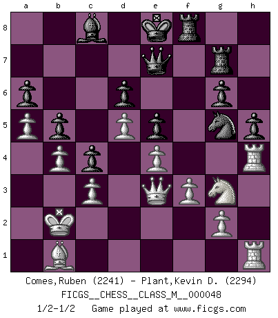 Last move : 1/2-1/2 2012 November 18 11:21:32 [Event "FICGS__CHESS__CLASS_M__000048"] [Site "FICGS"] [Date "2011.08.15"] [Round "1"] [White "Comes,Ruben"] [Black "Plant,Kevin D."] [Result "1/2-1/2"] [WhiteElo "2241"] [BlackElo "2294"] 1.e4 e5 2.Nf3 Nc6 3.Bb5 a6 4.Ba4 Nf6 5.O-O Be7 6.Re1 b5 7.Bb3 d6 8.c3 O-O 9.h3 Na5 10.Bc2 c5 11.d4 Qc7 12.d5 Nc4 13.b3 Nb6 14.a4 h6 15.Qe2 Bd7 16.Be3 Rfb8 17.a5 Nc8 18.b4 Rb7 19.Rc1 c4 20.Nbd2 Bf8 21.Rd1 Qd8 22.Rac1 Ne7 23.Nh4 Ne8 24.Bb6 Qc8 25.Nf1 Nf6 26.Ng3 Ng6 27.Nxg6 fxg6 28.Be3 g5 29.f3 Qe8 30.Rf1 Bc8 31.Bb1 g6 32.Rcd1 Rf7 33.Rfe1 Bb7 34.Rc1 Be7 35.Qd2 Bd8 36.Kh2 Bc7 37.Rh1 Qe7 38.Kg1 Bb8 39.Rf1 Bc8 40.Bb6 Nh7 41.Rf2 Ba7 42.Bxa7 Qxa7 43.Kf1 Kg7 44.Ke1 Qe7 45.Kd1 Bb7 46.Kc2 Qf6 47.Nf1 Qf4 48.Qe1 Raf8 49.Kb2 Qf6 50.Ne3 Qd8 51.R2f1 Bc8 52.h4 gxh4 53.Rxh4 h5 54.Qf2 Ng5 55.Rfh1 Kg8 56.R4h2 Qe7 57.Nf1 Rg7 58.Ng3 Kf7 59.Qe3 Ke8 60.Rh4 1/2-1/2 Ruy Lopez : Closed Kingside Castling by player White (move 5) Kingside Castling by player Black (move 8) This chess game ended in a draw. Follow this game move after move (download)All my games are real. (Bobby Fischer) Heutzutage gewinnt im Turnier nicht derjenige Spieler, der weitreichende Pläne entwirft, sondern einfach jener, der Zug um Zug kämpft. (David Bronstein) El Ajedrez es imaginación. (David Bronstein) J'ai toujours senti une vague pitié pour l'homme qui ne connaît rien aux échecs, tout comme j'en aurais pour un homme ignorant de l'amour. Les Echecs, comme la musique ou comme l'amour, ont le pouvoir de rendre heureux. (Siegbert Tarrasch) They say in chess you've got to kill the queen, and then you mate it... Oh I, do you ? (Red Hot Chili Peppers, Fortune faded)