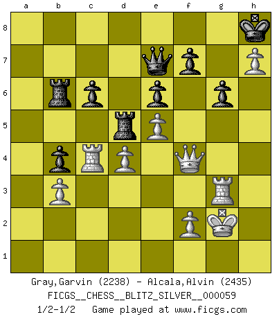 Last move : 1/2-1/2 2011 August 15 22:10:59 [Event "FICGS__CHESS__BLITZ_SILVER__000059"] [Site "FICGS"] [Date "2011.08.15"] [Round "1"] [White "Gray,Garvin"] [Black "Alcala,Alvin"] [Result "1/2-1/2"] [WhiteElo "2238"] [BlackElo "2435"] 1.d4 Nf6 2.Nf3 d5 3.c4 c6 4.Nc3 e6 5.e3 Nbd7 6.Qc2 Bd6 7.g4 h6 8.Bd2 dxc4 9.Bxc4 b5 10.Be2 Bb7 11.e4 b4 12.Na4 Be7 13.e5 Nd5 14.O-O a5 15.Rfc1 Qc7 16.a3 Ba6 17.Bd1 Bb5 18.axb4 Nxb4 19.Qe4 Bd3 20.Qe3 Bg6 21.Rc4 Qb7 22.Bxb4 axb4 23.Rac1 Ra6 24.b3 O-O 25.h4 Rc8 26.h5 Bh7 27.Bc2 Bxc2 28.R4xc2 Nb6 29.Nxb6 Qxb6 30.g5 Bxg5 31.Nxg5 hxg5 32.Qxg5 Qd8 33.Qg4 Kh8 34.Rc4 Qf8 35.Kg2 Rb6 36.Rh1 Ra8 37.Rh3 Qe7 38.Rf3 Rf8 39.Qf4 Qd8 40.h6 g6 41.Rc2 Qe7 42.Rc1 Ra6 43.Rc4 Rb6 44.Rc2 Ra6 45.Rc1 Kh7 46.Rc4 Rb6 47.Kh3 Kg8 48.Kh2 Rc8 49.Qe3 Kh7 50.Rf6 Rc7 51.Qf4 Ra7 52.Qe4 Rba6 53.Qe3 Qf8 54.Rf3 Rc7 55.Rc1 Ra3 56.Qe4 Qe7 57.Qf4 Ra2 58.Rg3 Kh8 59.h7 Ra6 60.Rh3 Rc8 61.Kg2 Rd8 62.Rg3 Rd5 63.Rc4 Rb6 1/2-1/2 Queen's pawn game Kingside Castling by player White (move 14) Kingside Castling by player Black (move 24) This chess game ended in a draw. Follow this game move after move (download)Up to this point White has been following well-known analysis. But now he makes a fatal error: he begins to use his own head. (Siegbert Tarrasch) Ihnen, Herr Lasker, habe ich nur drei Worte zu sagen: Schach und matt. (Siegbert Tarrasch) Tu eres para mi la Reina en d8 y yo soy el Peón en d7!!. (GM Eduard Gufeld) Vous savez, camarade Pachman, je n'éprouve pas de plaisir à être ministre, je jouerais plutôt aux échecs comme vous, ou alors ferais une révolution au Venezuela. (Che Guevara à Ludek Pachman, 'Checkmate in Prague', 1975) You can think I'm wrong, but that's no reason to quit thinking. (Gregory House, House M.D.)