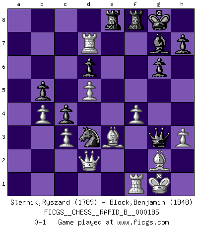 Last move : 0-1 2011 November 4 22:23:6 [Event "FICGS__CHESS__RAPID_B__000185"] [Site "FICGS"] [Date "2011.08.16"] [Round "1"] [White "Sternik,Ryszard"] [Black "Block,Benjamin"] [Result "0-1"] [WhiteElo "1789"] [BlackElo "1848"] 1.e4 c5 2.Nc3 Nc6 3.g3 g6 4.Bg2 Bg7 5.Nf3 d6 6.d3 Nf6 7.O-O O-O 8.h3 Rb8 9.a4 a6 10.Be3 e5 11.Qd2 Nd4 12.Kh2 Qd7 13.Ng1 b5 14.axb5 axb5 15.f4 exf4 16.gxf4 Nh5 17.Nd5 Bb7 18.Ra7 Nc6 19.Ra2 f5 20.c3 fxe4 21.dxe4 Ne5 22.b3 c4 23.b4 Nd3 24.Ne2 Bxd5 25.exd5 Qe7 26.Ra7 Qh4 27.Kg1 Rbe8 28.Rd7 Ng3 29.Nxg3 Qxg3 0-1 Sicilian : Closed Kingside Castling by player White (move 7) Kingside Castling by player Black (move 7) Player Black won this chess game. Follow this game move after move (download)If one piece is badly posted, the whole game is bad. (Tarrasch) Ein Gewinn durch eine ungenaue Kombination, sei sie auch noch so vorzeigbar, erfüllt mich mit Schaudern. (Wilhelm Steinitz) No solamente yo pronostico su triunfo sobre Botvinnik, sino que me adelanto y digo que probablemente Fischer es el jugador de Ajedrez mas grande que haya existido. (John Collins) Le jeu d'échecs fait naître et fortifie en nous plusieurs qualités précieuses dans le cours de l'existence, telles que la prévoyance, la circonspection, la prudence, et la persévérance. (Benjamin Franklin - 1783, la morale des échecs) In every real man a child is hidden that wants to play. (Friedrich Nietzsche)