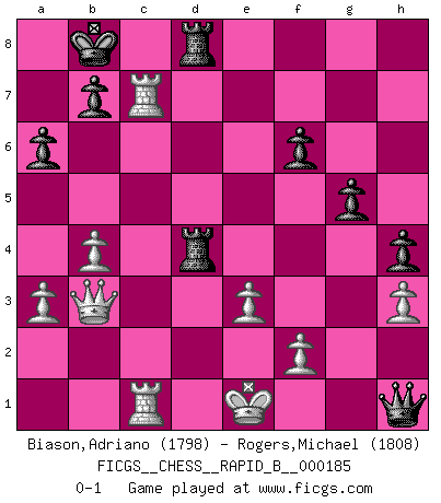 Last move : 0-1 2011 October 28 0:54:27 [Event "FICGS__CHESS__RAPID_B__000185"] [Site "FICGS"] [Date "2011.08.16"] [Round "1"] [White "Biason,Adriano"] [Black "Rogers,Michael"] [Result "0-1"] [WhiteElo "1798"] [BlackElo "1808"] 1.g4 d5 2.h3 e5 3.Bg2 Nc6 4.c4 Nge7 5.cxd5 Nxd5 6.Nc3 Be6 7.d3 Qd7 8.Nf3 f6 9.Bd2 O-O-O 10.a3 Be7 11.Rc1 Kb8 12.Qc2 h5 13.g5 Nxc3 14.Qxc3 Bd5 15.Rg1 Rhe8 16.b4 a6 17.Qb2 e4 18.dxe4 Bxe4 19.Bf4 fxg5 20.Ne5 Nxe5 21.Bxe5 Bf6 22.Bxf6 gxf6 23.Bxe4 Rxe4 24.Rg3 h4 25.Rgc3 Rd4 26.Qb3 Qd6 27.Rxc7 Qh2 28.e3 Qh1+ 0-1 This chess game has been lost on time (started : 2011.08.16 0:32:48) Grob's attack Queenside Castling by player Black (move 9) Player Black won this chess game. Follow this game move after move (download)Not only will I predict his triumph over Botvinnik, but I'll go further and say that he'll probably be the greatest Chess player that ever lived. (John Collins) Der beste Spieler in einem Turnier gewinnt es nie. Er landet auf Platz zwei oder drei. (Siegbert Tarrasch) El Ajedrez, como cualquier actividad creativa, solo puede existir a través del esfuerzo combinado de aquellos que tienen talento creativo y de aquellos que poseen la habilidad de organizar su trabajo creativo. (Mikhail Botvinnik) Que feriez-vous si vous étiez en train de jouer aux échecs et que la fin du monde arrive ? Je continuerais à jouer. (Saint Borromée) CHESS, n. f. [echecs, Fr.] A nice and abstruse game, in which two sets of puppets are moved in opposition to each other. (Dr Samuel Johnson, A Dictionary Of The English Language, 1755)