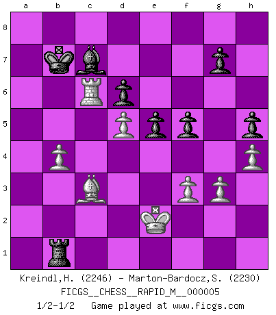 Last move : 1/2-1/2 2007 May 15 12:7:12 [Event "FICGS__CHESS__RAPID_M__000005"] [Site "FICGS"] [Date "2007.01.01"] [Round "1"] [White "Kreindl,Helmut"] [Black "Marton-Bardocz,Sandor"] [Result "1/2-1/2"] [WhiteElo "2246"] [BlackElo "2230"] 1.d4 Nf6 2.Bg5 Ne4 3.Bf4 d6 4.f3 Nf6 5.e4 c6 6.Qd2 Nbd7 7.Nc3 e5 8.Be3 b5 9.d5 cxd5 10.Nxd5 Nxd5 11.Qxd5 Rb8 12.Qd2 a6 13.Ne2 Nb6 14.Nc3 Be6 15.Be2 Be7 16.O-O O-O 17.Nd5 Bxd5 18.exd5 Qc7 19.a4 Rfc8 20.axb5 axb5 21.Ra6 Nc4 22.Bxc4 bxc4 23.Qc3 Qd7 24.Ra7 Rb7 25.Rfa1 Bg5 26.Bf2 Rxa7 27.Rxa7 Qb5 28.Ra5 Qb7 29.g3 h5 30.b3 cxb3 31.Qxb3 Qxb3 32.cxb3 Rb8 33.b4 Kf8 34.Be1 Bd8 35.Ra1 Rb5 36.Rd1 f5 37.h4 Ke7 38.Kf2 Kd7 39.Ke2 Kc7 40.Rc1+ Kb7 41.Rd1 Rb6 42.Rc1 Rb5 43.Rd1 Rb6 44.Rc1 Ra6 45.Rc2 Ra3 46.Bd2 Rb3 47.Rc6 Bc7 48.Bc3 Rb1 1/2-1/2 Trompowsky attack (Ruth, Opovcensky Opening) Kingside Castling by player White (move 16) Kingside Castling by player Black (move 16) This chess game ended in a draw. Follow this game move after move (download)There must have been a time when men were demigods, or they could not have invented Chess. (Gustav Schenk) Wenn du nicht weißt was du tun sollst, warte bis dein Gegner eine Idee hat. Sie wird sicher schlecht sein. (Siegbert Tarrasch) Un buen sacrificio es aquel que aunque no sea necesariamente sólido, deja a tu oponente aturdido y confuso. (Rudolph Spielmann) Même si vous avez un bon coup à faire, regardez toujours s'il n'y en a pas un qui lui soit préférable. (Pedro Damiano) . 'gn is not allowed in chess unless n is an integer between 1 and 8 inclusive, where 1 and 8 are to interpreted as the standard numerals standing for integers in the ordered real-closed field R, with the *canonical* ordering. (As opposed to, say, an integer in the domain Z[2+i*sqrt(5)] or an integer in some exotic Grothendieck topos). (Normajean Yates)