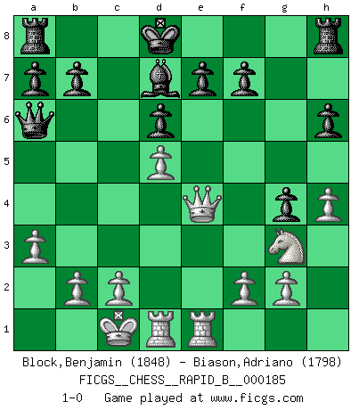 Last move : 1-0 2011 November 6 0:36:55 [Event "FICGS__CHESS__RAPID_B__000185"] [Site "FICGS"] [Date "2011.08.16"] [Round "1"] [White "Block,Benjamin"] [Black "Biason,Adriano"] [Result "1-0"] [WhiteElo "1848"] [BlackElo "1798"] 1.e4 g5 2.d4 h6 3.Nc3 Bg7 4.Be3 d6 5.Qd2 Nf6 6.h4 g4 7.Nge2 c6 8.Ng3 Qa5 9.a3 Be6 10.O-O-O Na6 11.d5 cxd5 12.Bb5+ Kd8 13.Bxa6 Qxa6 14.Nxd5 Nxd5 15.exd5 Bd7 16.Bd4 Bxd4 17.Qxd4 Rh7 18.Qe4 Rh8 19.Rhe1 1-0 This chess game has been lost on time (started : 2011.08.16 0:32:48) Reversed Grob (Borg/Basman defense/macho Grob) Queenside Castling by player White (move 10) Player White won this chess game. Follow this game move after move (download)It was clear to me that the vulnerable point of the American Grandmaster (Bobby Fischer) was in double-edged, hanging, irrational positions, where he often failed to find a win even in a won position. (Efim Geller) Schach ist das Spiel, das die Verrückten gesund hält. (Albert Einstein) Juega la Apertura como un libro, el Juego Medio como un mago y los Finales como una máquina. (Spielmann) Demandez au pauvre Cg1 ce qu'il en pense. Eduard Gufeld à propos de la variante Saemisch de l'Est-Indienne. Chess is as much a mystery as women. (Purdy)