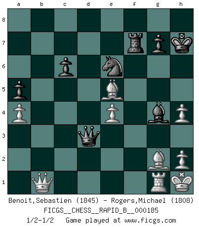 Last move : 1/2-1/2 2011 September 30 20:46:47 [Event "FICGS__CHESS__RAPID_B__000185"] [Site "FICGS"] [Date "2011.08.16"] [Round "1"] [White "Benoit,Sebastien"] [Black "Rogers,Michael"] [Result "1/2-1/2"] [WhiteElo "1845"] [BlackElo "1808"] 1.d4 f5 2.g3 e6 3.Bg2 Nf6 4.c4 c6 5.Nf3 d5 6.O-O Bd6 7.b3 Qe7 8.Bb2 O-O 9.Nbd2 Ne4 10.Ne5 Nd7 11.Ndf3 a5 12.a4 Nxe5 13.Nxe5 Bd7 14.f3 Ng5 15.Qd2 Nf7 16.Nd3 b6 17.e4 fxe4 18.fxe4 dxc4 19.bxc4 e5 20.c5 bxc5 21.dxe5 Bc7 22.Qc3 Bg4 23.Rac1 Rab8 24.Kh1 h5 25.Ba1 Rbd8 26.Rf4 Rde8 27.e6 Ng5 28.Rxf8+ Rxf8 29.Nxc5 Bd6 30.Nd3 h4 31.gxh4 Nxe6 32.Ne5 Bxe5 33.Qxe5 Qd7 34.Rg1 Rf7 35.Qb8+ Kh7 36.Be5 Qd3 37.Qb1 1/2-1/2 Dutch defense Kingside Castling by player White (move 6) Kingside Castling by player Black (move 8) This chess game ended in a draw. Follow this game move after move (download)Only the player with the initiative has the right to attack. (Wilhelm Steinitz) Schach verlangt totale Konzentration. (Robert James Fischer) Un sacrificio se refuta mucho mejor al aceptarlo. (Wilhelm Steinitz) Les Echecs ont trois composantes : le temps, l'espace et le matériel en dernier. (Mikhail Tal) There are two kinds of tragedy in this world, one is not getting what you want and the other is getting. (Lord of war)