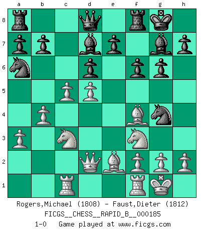 Last move : 1-0 2011 September 3 16:36:0 [Event "FICGS__CHESS__RAPID_B__000185"] [Site "FICGS"] [Date "2011.08.16"] [Round "1"] [White "Rogers,Michael"] [Black "Faust,Dieter"] [Result "1-0"] [WhiteElo "1808"] [BlackElo "1812"] 1.e4 Nf6 2.e5 Nd5 3.d4 d6 4.c4 Nb6 5.exd6 cxd6 6.Nc3 g6 7.Be3 Bg7 8.Rc1 O-O 9.b3 N6d7 10.Be2 Nf6 11.Nf3 Qa5 12.Qd2 Nc6 13.d5 Nb8 14.O-O Na6 15.a3 Ng4 16.Bg5 f6 17.b4 Qd8 18.Bf4 Bd7 19.c5 1-0 Alekhine's defense : Exchange variation Kingside Castling by player Black (move 8) Kingside Castling by player White (move 14) Player White won this chess game. Follow this game move after move (download)At this time Fischer is simply a level above all the best Chessplayers in the world. (John Jacobs) Im Schach gibt es keinen Platz für Galanterie. (Irving Chernev) El poder defensivo de una pieza clavada, solamente es imaginario. (Aaron Nimzovich) Le système Elo représente seulement une moyenne. Il est simplement un indicateur de votre stabilité. (Anatoli Karpov) The weakness of an artist is dogma. (Josh Waitzkin)