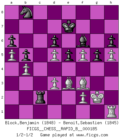 Last move : 1/2-1/2 2011 October 14 14:18:9 [Event "FICGS__CHESS__RAPID_B__000185"] [Site "FICGS"] [Date "2011.08.16"] [Round "1"] [White "Block,Benjamin"] [Black "Benoit,Sebastien"] [Result "1/2-1/2"] [WhiteElo "1848"] [BlackElo "1845"] 1.e4 c5 2.Nf3 d6 3.d4 cxd4 4.Nxd4 Nf6 5.Nc3 a6 6.Be3 e5 7.Nb3 Be6 8.Be2 Be7 9.Qd3 Nc6 10.a3 O-O 11.O-O Na5 12.Nxa5 Qxa5 13.Rac1 Rac8 14.b4 Qc7 15.Nd5 Bxd5 16.exd5 Qc3 17.Bd2 Qxd3 18.cxd3 Rfd8 19.a4 g6 20.a5 Nd7 21.Rc4 b5 22.Rc6 Nb8 23.R6c1 f5 24.g3 Bf6 25.h4 Kf7 26.h5 Ke7 27.Kg2 Rg8 28.Bf3 Kd7 29.Be3 Rc7 30.Bb6 Rxc1 31.Rxc1 Rc8 32.Rh1 g5 33.g4 h6 34.gxf5 Rc2 35.Be3 Ke7 1/2-1/2 Sicilian : Najdorf, Byrne (English) attack Kingside Castling by player Black (move 10) Kingside Castling by player White (move 11) This chess game ended in a draw. Follow this game move after move (download)Some part of a mistake is always correct. (Savielly Tartakover) Schon mancher Spieler hat aufgegeben, um zu vermeiden, daß er eine Figur verliert. (Savielly Grigorievitsch Tartakower) Sin errores no puede haber brillantez. (Emanuel Lasker) 'L'échange des dames est un coup dur pour les deux adversaires...' Un journaliste lors d'une partie du match Spassky-Fischer Empty your mind, be formless, shapeless — like water. (Bruce Lee)