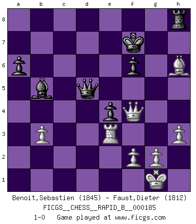 Last move : 1-0 2011 September 27 10:35:57 [Event "FICGS__CHESS__RAPID_B__000185"] [Site "FICGS"] [Date "2011.08.16"] [Round "1"] [White "Benoit,Sebastien"] [Black "Faust,Dieter"] [Result "1-0"] [WhiteElo "1845"] [BlackElo "1812"] 1.e4 c6 2.d4 d5 3.Nc3 dxe4 4.Nxe4 Nd7 5.Bc4 Ngf6 6.Ng5 e6 7.Qe2 Nb6 8.Bb3 h6 9.N5f3 c5 10.Bf4 Nbd5 11.Be5 Qa5+ 12.Nd2 b5 13.dxc5 Bxc5 14.Ngf3 Ba6 15.O-O O-O 16.Bxd5 Nxd5 17.Nb3 Qb6 18.Nxc5 Qxc5 19.Rfe1 Rfe8 20.Bd4 Qc8 21.Rac1 f6 22.Nh4 e5 23.Be3 e4 24.Bd2 Qd7 25.a4 Rab8 26.Rcd1 g5 27.Qh5 gxh4 28.Bxh6 Re5 29.Qxh4 Rbe8 30.axb5 Bxb5 31.b3 Qf5 32.c4 Kf7 33.Rxd5 Rxd5 34.cxd5 Rh8 35.Qf4 Qxd5 36.h3 a6 37.Re3 1-0 Caro-Kann : Steinitz variation Kingside Castling by player White (move 15) Kingside Castling by player Black (move 15) Player White won this chess game. Follow this game move after move (download)The defensive power of a pinned piece is only imaginary. (Aaron Nimzovich) Ich bin Weltmeister und muß mit niemandem irgend etwas diskutieren. (Viswanathan Anand) Las ideas audaces son como las piezas del Ajedrez que avanzan hacia adelante. Ellas pueden ser vencidas, pero también pueden iniciar una partida victoriosa. (Goethe) Les sacrifices démontrent seulement que quelqu'un a gaffé. (Savielly Tartacover) You can only get smarter by playing a smarter opponent. (Revolver, movie)