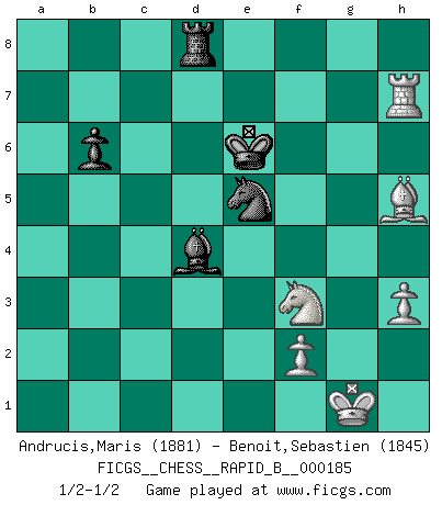 Last move : 1/2-1/2 2011 October 9 3:2:38 [Event "FICGS__CHESS__RAPID_B__000185"] [Site "FICGS"] [Date "2011.08.16"] [Round "1"] [White "Andrucis,Maris"] [Black "Benoit,Sebastien"] [Result "1/2-1/2"] [WhiteElo "1881"] [BlackElo "1845"] 1.e4 c5 2.Nc3 Nc6 3.Nf3 g6 4.Bc4 Bg7 5.d3 d6 6.O-O Nf6 7.a4 O-O 8.h3 Bd7 9.Bf4 Nh5 10.Bh2 e5 11.Nd5 Na5 12.Ba2 Bxa4 13.Qd2 b6 14.b4 cxb4 15.Qxb4 Bc6 16.d4 Nf4 17.Bxf4 exf4 18.Qd2 g5 19.g3 Kh8 20.gxf4 gxf4 21.Qxf4 Rc8 22.Rfd1 Bxd5 23.Bxd5 Qf6 24.Qxf6 Bxf6 25.Ra2 Rc3 26.e5 Be7 27.Rd3 Rxd3 28.cxd3 Rd8 29.exd6 Bxd6 30.Bxf7 Kg7 31.Bc4 Kf6 32.Bb5 Bb4 33.Rb2 Bc3 34.Rc2 Bxd4 35.Rc7 Rd5 36.Be8 Bc5 37.d4 Bxd4 38.Rxa7 Rd8 39.Bh5 Nc6 40.Rf7+ Ke6 41.Rxh7 Ne5 1/2-1/2 Sicilian : Closed, 2...Nc6 Kingside Castling by player White (move 6) Kingside Castling by player Black (move 7) This chess game ended in a draw. Follow this game move after move (download)Of Chess it has been said that life is not long enough for it, but that is the fault of life, not Chess. (William Ewart Napier) Ich kenne Menschen, die allen Willen der Welt besitzen und doch nicht Schach spielen können. (Robert James Fischer) Mis oponentes también hacen buenas movidas. A veces yo no tomo esas cosas en consideración. (Bobby Fischer) Votre prénom est 'Tactique', votre deuxième prénom est 'Tactique' et votre nom est 'Tactique'. (Ken Smith) I find your interest interesting. (Gregory House, House M.D.)