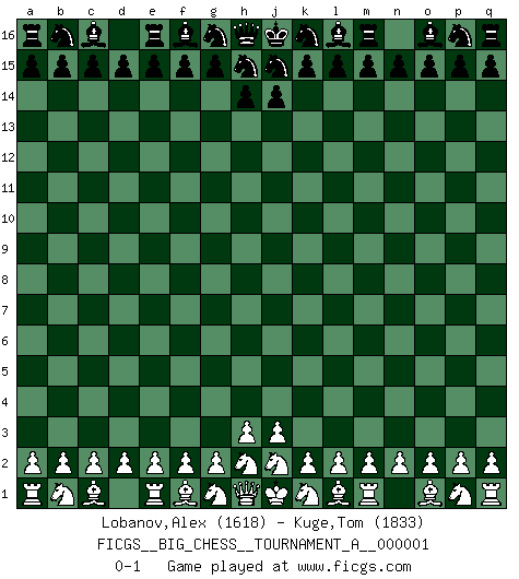 Last move : 0-1 2011 September 15 10:20:23 [Event "FICGS__BIG_CHESS__TOURNAMENT_A__000001"] [Site "FICGS"] [Date "2011.08.16"] [Round "1"] [White "Lobanov,Alex"] [Black "Kuge,Tom"] [Result "0-1"] [WhiteElo "1618"] [BlackElo "1833"] 0-1 This big chess game has been lost on time (started : 2011.08.16 5:48:56) Follow this game move after move (download)We must make sure that Chess will not be like a dead language, very interesting, but for a very small group. (Sytze Faber) Frage: Gibt es etwas was Sie mehr lieben als Autobahnen ohne Tempobegrenzungen? - Antwort: Deutsche Frauen ohne Tempobegrenzungen. (Loek van Wely) Bobby es el jugador de Ajedrez mas fino que este país jamás haya producido. Su memoria para las movidas, su brillantez en soñar combinaciones y su feróz determinación por la victoria son algo extraño. (John Collins) Mais n'est-ce pas déjà le limiter injurieusement que d'appeler les échecs un jeu? N'est-ce pas aussi une science, un art, ou quelque chose qui, comme le cercueil de Mahomet entre ciel et terre, est suspendu entre l'un et l'autre, et qui réunit un nombre incroyable de contraires ? (Stefan Zweig) I know the human being and fish can coexist peacefully. (George W. Bush, Saginaw sept. 29, 2000)