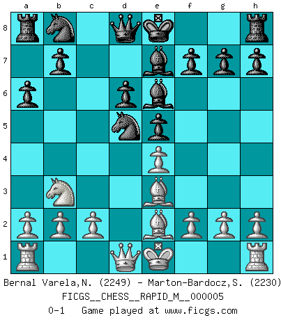 Last move : 0-1 2007 March 4 6:27:30 [Event "FICGS__CHESS__RAPID_M__000005"] [Site "FICGS"] [Date "2007.01.01"] [Round "1"] [White "Bernal Varela,Nelson"] [Black "Marton-Bardocz,Sandor"] [Result "0-1"] [WhiteElo "2249"] [BlackElo "2230"] 1.e4 c5 2.Nf3 d6 3.d4 cxd4 4.Nxd4 Nf6 5.Nc3 a6 6.Be3 e5 7.Nb3 Be7 8.Be2 Be6 9.Nd5 Nxd5 0-1 This chess game has been lost on time (started : 2007.01.01 23:9:0) Sicilian : Najdorf, Byrne (English) attack Player Black won this chess game. Follow this game move after move (download)By playing at Chess then, we may learn: First: Foresight... Second: Circumspection... Third: Caution... And lastly, we learn by Chess the habit of not being discouraged by present bad appearances in the state of our affairs, the habit of hoping for a favorable chance, and that of persevering in the secrets of resources. (Benjamin Franklin) Moralische Siege zählen nicht. (Savielly Grigorievitsch Tartakower) El hombre es un frívolo, una creatura engañosa y como un jugador de Ajedrez, se preocupa mas por el proceso de obtener su meta que de la meta por sí misma. (Dostoyevsky) Les ravages du H expliquent la différence de niveau entre Tal et Thal [Abergel]. Art disturbs, science reassures. (Georges Braque, Le Jour et la Nuit)