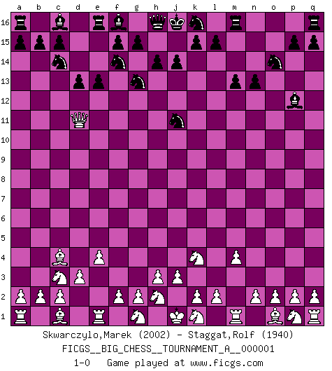 Last move : 1-0 2011 August 29 10:1:34 [Event "FICGS__BIG_CHESS__TOURNAMENT_A__000001"] [Site "FICGS"] [Date "2011.08.16"] [Round "1"] [White "Skwarczylo,Marek"] [Black "Staggat,Rolf"] [Result "1-0"] [WhiteElo "2002"] [BlackElo "1940"] 1.j2-k4 j15-k13 2.h1-o7 h15-g13 3.o7-o15 p16-o14 4.o15-f7 b16-c14 5.b1-c3 n15-n13 6.e2-e4 d15-d13 7.f1-c4 m15-m13 8.d2-d3 e15-e13 9.m2-m4 l16-p12 10.l1-p5 o16-j11 11.p5-j11 k13-j11 12.f7-d5 g16-f14 13.d5-d11 1-0 Follow this game move after move (download)Some sacrifices are sound; the rest are mine. (Mikhail Tal) Im Hotelzimmer gab es nur zwei Schaben. (Über die Turnierbedingungen) (Peter Swidler) Cuando la partida de Ajedrez termina, el Peón y el Rey regresan a la misma caja. (Irish saying) Il a essayé de se convaincre qu'il pourrait empêcher toutes les erreurs et ne jamais perdre. L'horreur ! Gary Kasparov au sujet de Robert Fischer. Wisdom is the reward you get for a lifetime of listening when you'd have preferred to talk. (Doug Larson)