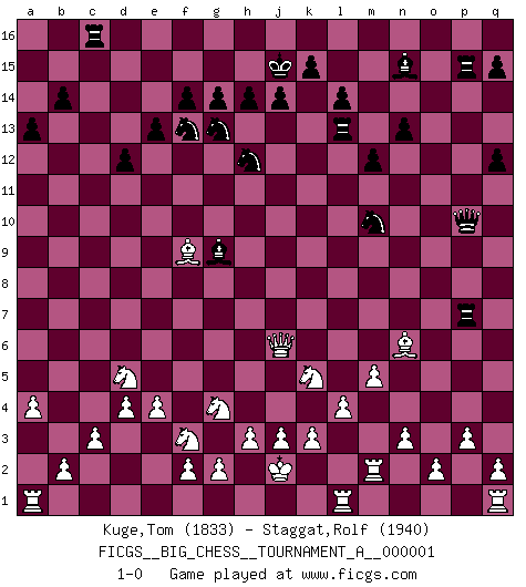 Last move : 1-0 2011 December 22 16:56:44 [Event "FICGS__BIG_CHESS__TOURNAMENT_A__000001"] [Site "FICGS"] [Date "2011.08.16"] [Round "1"] [White "Kuge,Tom"] [Black "Staggat,Rolf"] [Result "1-0"] [WhiteElo "1833"] [BlackElo "1940"] 1.j2-k4 j15-k13 2.h1-o7 h15-g13 3.o7-o15 p16-o14 4.o15-c4 b16-c14 5.d2-d4 m15-m13 6.p1-o3 n15-n13 7.m2-m4 d15-d13 8.l1-o4 h16-o10 9.c1-k8 e15-e13 10.h2-g4 f16-b12 11.n2-n3 l16-p12 12.k1-h2 k16-h15 13.e2-e4 o16-l13 14.g1-f3 c16-h11 15.o1-b13 f15-f14 16.c4-d5 g16-e15 17.f1-a6 a15-a14 18.b13-e10 c14-d12 19.e10-d9 q16-o16 20.b1-c3 j16-j15 21.j1-j2 o14-n12 22.k8-l7 o10-o7 23.k2-k3 o7-j12 24.d5-l5 p12-l8 25.k4-h5 b12-f8 26.m4-m5 e15-f13 27.h2-j4 f8-g9 28.j4-k6 o16-o11 29.l5-l6 a16-d16 30.k6-l8 h11-l8 31.l7-q12 p15-p13 32.l6-l8 o11-l11 33.l8-o5 p13-q12 34.l2-l4 m16-p16 35.o5-q7 l13-n15 36.p2-p3 e16-o16 37.a6-b5 j12-k11 38.d9-f7 k11-m9 39.q7-g7 l15-l14 40.h5-f6 m9-p6 41.e1-l1 p16-p7 42.g7-g6 p6-q5 43.o3-m4 d12-e10 44.f7-j10 e10-g11 45.j10-n6 d13-d12 46.f6-e8 g9-e11 47.m1-m2 g15-g14 48.e8-g9 e11-g9 49.g6-b6 b15-b14 50.b6-a6 a14-a13 51.o4-j9 l11-l13 52.a6-c8 g13-e14 53.j9-g11 f13-g11 54.n6-e14 d16-e16 55.e14-n6 g11-f13 56.c8-c15 e16-b16 57.c15-f15 q5-l10 58.b5-h11 o16-f16 59.f15-c12 k13-h12 60.c12-j6 f16-p16 61.m4-k5 m13-m12 62.h11-k9 l10-p10 63.c3-d5 b16-c16 64.c2-c3 p16-p15 65.a2-a4 n12-m10 66.k9-h11 h15-g13 67.h11-f9 1-0 This big chess game has been lost on time (started : 2011.08.16 5:48:56) Follow this game move after move (download)When you see a good move, look for a better one. (Emanuel Lasker) Wer wird heute Abend ihr Gegner sein? -- Heute Abend spiele ich gegen die schwarzen Steine. (Akiba Rubinstein) El Ajedrez es como la guerra en un tablero. (Bobby Fischer) Les réformistes prétendent que les progrès de la théorie conduiront à la disparition des échecs, et qu'il faut, pour leur rendre vie, en remanier les règles. En réalité, qu'exprime cette affirmation? Le mépris de l'intuition, de l'imagination et de tous les autres éléments qui font des échecs un art. (Alexander Alekhine) A journey of a thousand sites begins with a single click. (Author unknown)