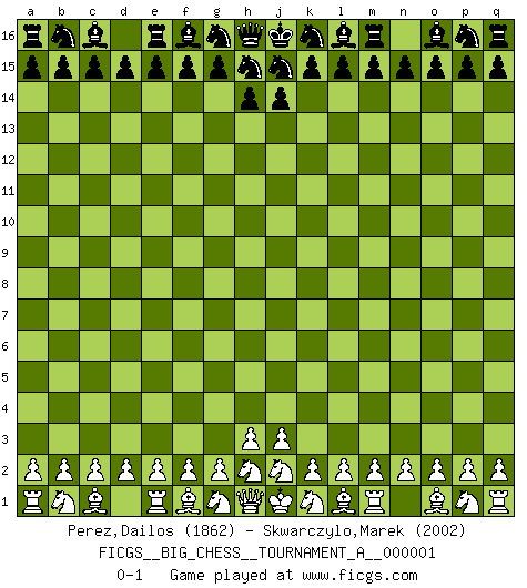 Last move : 0-1 2011 September 15 10:20:23 [Event "FICGS__BIG_CHESS__TOURNAMENT_A__000001"] [Site "FICGS"] [Date "2011.08.16"] [Round "1"] [White "Perez,Dailos"] [Black "Skwarczylo,Marek"] [Result "0-1"] [WhiteElo "1862"] [BlackElo "2002"] 0-1 This big chess game has been lost on time (started : 2011.08.16 5:48:56) Follow this game move after move (download)Nowadays, when you're not a grandmaster at 14, you can forget about it. (Anand Viswanathan) Ich verlor meine Bürgerrechte, mein Gehalt wurde mir nicht mehr bezahlt und ich wurde zensiert und durfte nicht mehr ins Ausland reisen. [nach dem Match Fischer-Taimanov 6:0] (Mark Taimanov) Cualquier cambio de material en una posición debe venir por medio de un mate, una captura o promoción de Peón. (Purdy) Les Echecs ont trois composantes : le temps, l'espace et le matériel en dernier. (Mikhail Tal) Convictions are more dangerous enemies of truth than lies. (Friedrich Nietzsche)
