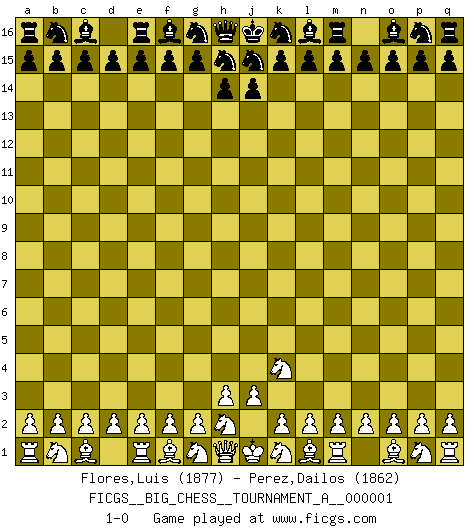 Last move : 1-0 2011 September 15 10:20:23 [Event "FICGS__BIG_CHESS__TOURNAMENT_A__000001"] [Site "FICGS"] [Date "2011.08.16"] [Round "1"] [White "Flores,Luis"] [Black "Perez,Dailos"] [Result "1-0"] [WhiteElo "1877"] [BlackElo "1862"] 1.j2-k4 1-0 This big chess game has been lost on time (started : 2011.08.16 5:48:56) Follow this game move after move (download)Fischer is the strongest player in the world. In fact, the strongest player who ever lived. (Larry Evans) Schach ist Leben. (Robert James Fischer) Diferente gente reacciona diferentemente en aceptar la derrota. (Bobby Fischer) 'L'échange des dames est un coup dur pour les deux adversaires...' Un journaliste lors d'une partie du match Spassky-Fischer The meaning of life is that it is to be lived, and it is not to be traded and conceptualized and squeezed into a pattern of systems. (Bruce Lee)