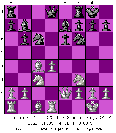 Last move : 1/2-1/2 2007 February 25 22:42:9 [Event "FICGS__CHESS__RAPID_M__000005"] [Site "FICGS"] [Date "2007.01.01"] [Round "1"] [White "Eizenhammer,Peter"] [Black "Shmelov,Denys"] [Result "1/2-1/2"] [WhiteElo "2223"] [BlackElo "2232"] 1.e4 e6 2.d4 d5 3.Nd2 c5 4.c3 cxd4 5.cxd4 dxe4 6.Nxe4 Nf6 7.Nc3 Be7 8.Nf3 O-O 9.Bc4 b6 10.O-O Bb7 11.Qe2 Nc6 12.Rd1 1/2-1/2 French : Tarrasch, Open variation Kingside Castling by player Black (move 8) Kingside Castling by player White (move 10) This chess game ended in a draw. Follow this game move after move (download)Alekhine is a poet who creates a work of art out of something that would hardly inspire another man to send home a picture post card. (Max Euwe) Rauchen ist dem Schachspieler bei seiner Arbeit, also im Wettkampf, untersagt. (Viktor Kortschnoi) Fischer es una tragedia del Ajedrez Americano a la par con Morphy y Pillsbury. (Mig Greengard) La tactique est l'élément le plus important du milieu de jeu. (Siegbert Tarrasch) Players are not good because they find tactics, it is about the way to find the positions in which those tactics are hidden. (Luc-Olivier Leclerc)