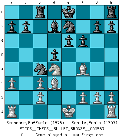 Last move : 0-1 2011 August 16 21:30:16 [Event "FICGS__CHESS__BULLET_BRONZE__000567"] [Site "FICGS"] [Date "2011.08.16"] [Round "1"] [White "Scandone,Raffaele"] [Black "Schmid,Pablo"] [Result "0-1"] [WhiteElo "1976"] [BlackElo "1907"] 1.e4 e6 2.d4 d5 3.Nc3 Bb4 4.e5 c5 5.a3 Bxc3+ 6.bxc3 Qa5 7.Bb2 cxd4 8.Qxd4 Ne7 9.Qb4 Nbc6 10.Bb5 Bd7 11.Qxa5 Nxa5 12.Bd3 Rc8 13.Ne2 Nc4 14.Bc1 Nxe5 15.Bf4 Nc4 16.Nd4 f6 0-1 This chess game has been lost on time (started : 2011.08.16 14:47:32) French : Winawer, Advance variation Player Black won this chess game. Follow this game move after move (download)I look one move ahead... the best ! (Siegbert Tarrasch) Das Spiel gibt uns die Genugtuung, die das Leben uns versagt. (Emanuel Lasker) Te sientas frente a un tablero y repentinamente tu corazón brinca. Tu mano tiembla al tomar una pieza y moverla. Pero lo que el Ajedrez te enseña es que tu debes permanecer ahí con calma y pensar de que si realmente es una buena idea o de que si hay otras ideas mejores. (Stanley Kubrick) Roi des jeux et jeu des rois, les échecs portent en eux un sentiment d'infini. Ils donnent à celui qui s'est efforcé d'en approfondir les arcanes l'impression de n'être pas à la mesure de l'homme; en fait, ils constituent un résumé de l'univers, un microcosme, et figurent cette grande échelle qui, dans les plans de la lumière descend jusqu'à la matière, qui des abîmes insondables remonte jusqu'en l'infini de Dieu. (Pyrame) If you are going through hell, keep going. (Winston Churchill)