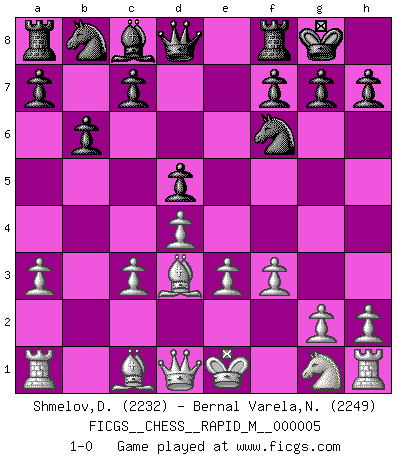 Last move : 1-0 2007 February 24 17:44:57 [Event "FICGS__CHESS__RAPID_M__000005"] [Site "FICGS"] [Date "2007.01.01"] [Round "1"] [White "Shmelov,Denys"] [Black "Bernal Varela,Nelson"] [Result "1-0"] [WhiteElo "2232"] [BlackElo "2249"] 1.d4 Nf6 2.c4 e6 3.Nc3 Bb4 4.f3 d5 5.a3 Bxc3+ 6.bxc3 O-O 7.cxd5 exd5 8.e3 b6 9.Bd3 1-0 This chess game has been lost on time (started : 2007.01.01 23:9:0) Nimzo-Indian : Kmoch variation Kingside Castling by player Black (move 6) Player White won this chess game. Follow this game move after move (download)I played Chess with him and would have beaten him sometimes only he always took back his last move, and ran the game out differently. (Mark Twain) Das Schachspiel übertrifft alle anderen Spiele so weit wie der Chimborasso einen Misthaufen. (Arthur Schopenhauer) Tu sabes que vas a perder. Aún cuando tenía la ventaja, yo sabía que iba a perder. - al estar jugando con Fischer (Andrew Soltis) Celui qui prend des risques peut perdre, celui qui n'en prend pas perd toujours. (Xavier Tartacover) Whenever people agree with me, I always feel I must be wrong. (Oscar Wilde)