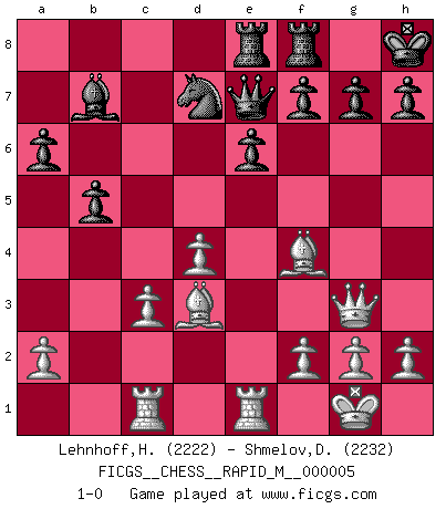 Last move : 1-0 2007 March 18 20:26:6 [Event "FICGS__CHESS__RAPID_M__000005"] [Site "FICGS"] [Date "2007.01.01"] [Round "1"] [White "Lehnhoff,Heinz-Georg"] [Black "Shmelov,Denys"] [Result "1-0"] [WhiteElo "2222"] [BlackElo "2232"] 1.d4 Nf6 2.c4 e6 3.Nc3 Bb4 4.e3 O-O 5.Bd3 c5 6.Nf3 d5 7.O-O cxd4 8.exd4 dxc4 9.Bxc4 b6 10.Bg5 Bb7 11.Ne5 Nbd7 12.Qe2 Bxc3 13.bxc3 Qc7 14.Nxd7 Nxd7 15.Rac1 Qd6 16.Qg4 Kh8 17.Rfe1 Rae8 18.Bb5 a6 19.Bf4 Qe7 20.Bd3 b5 21.Qg3 1-0 Nimzo-Indian : 4.e3 O-O, 5.Bd3 Kingside Castling by player Black (move 4) Kingside Castling by player White (move 7) Player White won this chess game. Follow this game move after move (download)At this time Fischer is simply a level above all the best Chessplayers in the world. (John Jacobs) Kasparov ist eine Art Monster mit hundert Augen, denen auch nicht das Geringste entgeht. (Tony Miles) Nunca nadie ha ganado una partida de Ajedrez rindiendose. (Unknown) Le système Elo représente seulement une moyenne. Il est simplement un indicateur de votre stabilité. (Anatoli Karpov) The right perception of any matter and a misunderstanding of the same matter do not wholly exclude each other. (Kafka's the trial)
