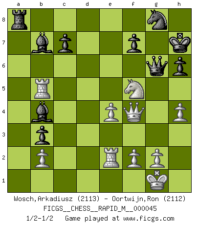 Last move : 1/2-1/2 2011 November 29 15:20:3 [Event "FICGS__CHESS__RAPID_M__000045"] [Site "FICGS"] [Date "2011.08.17"] [Round "1"] [White "Wosch,Arkadiusz"] [Black "Oortwijn,Ron"] [Result "1/2-1/2"] [WhiteElo "2113"] [BlackElo "2112"] 1.e4 e5 2.Nf3 Nc6 3.Bc4 Bc5 4.c3 Nf6 5.d3 d6 6.O-O a6 7.Bb3 O-O 8.Nbd2 b5 9.Re1 Ng4 10.Re2 Nf6 11.Nf1 h6 12.Ng3 a5 13.a4 b4 14.d4 Bb6 15.Bd5 Bb7 16.Bxh6 gxh6 17.Qc1 Kh7 18.Bxc6 Bxc6 19.dxe5 dxe5 20.Nxe5 Bb7 21.cxb4 axb4 22.Nf5 Ng8 23.a5 Bxa5 24.h4 Re8 25.Qf4 b3 26.Rc1 Qf6 27.Rc5 Re6 28.Ng4 Qg6 29.Ne5 Rxe5 30.Rxe5 Bb4 31.Rb5 1/2-1/2 Giuoco Piano Kingside Castling by player White (move 6) Kingside Castling by player Black (move 7) This chess game ended in a draw. Follow this game move after move (download)Fischer is an American Chess tragedy on par with Morphy and Pillsbury. (Mig Greengard) Oft bringt ein stiller Zug das Erdbeben. (Richard Reti) Uno no tiene que jugar muy bien, es suficiente jugar mejor que el oponente. (Siegbert Tarrasch) Les Echecs sont affaire de jugement sensible. Savoir quand frapper et quand esquiver. (Fischer) God is an atheist. (Unknown)