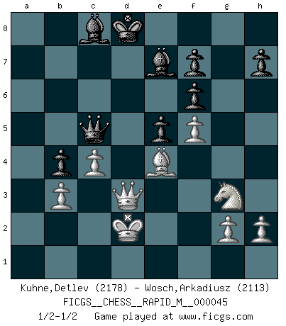 Last move : 1/2-1/2 2011 November 19 18:28:30 [Event "FICGS__CHESS__RAPID_M__000045"] [Site "FICGS"] [Date "2011.08.17"] [Round "1"] [White "Kuhne,Detlev"] [Black "Wosch,Arkadiusz"] [Result "1/2-1/2"] [WhiteElo "2178"] [BlackElo "2113"] 1.e4 c5 2.Nf3 Nc6 3.d4 cxd4 4.Nxd4 Nf6 5.Nc3 d6 6.Bg5 e6 7.Qd2 a6 8.O-O-O Bd7 9.f4 b5 10.Bxf6 gxf6 11.Kb1 Qb6 12.Nxc6 Bxc6 13.f5 b4 14.Ne2 e5 15.Ng3 Qc5 16.Nh5 Be7 17.Bd3 O-O-O 18.Qe2 d5 19.Ng3 a5 20.exd5 Bxd5 21.c4 Bb7 22.Be4 Ba6 23.b3 Rxd1+ 24.Rxd1 Rd8 25.Kc2 a4 26.Rxd8+ Kxd8 27.Kd2 axb3 28.axb3 Bc8 29.Qd3+ 1/2-1/2 Sicilian defense Queenside Castling by player White (move 8) Queenside Castling by player Black (move 17) This chess game ended in a draw. Follow this game move after move (download)It is no time to be playing Chess when the house is on fire. (Italian Proverb) Charakterschwächen offenbaren sich normalerweise während einer Schachpartie. (Garry Kasparov) Las combinaciones han sido siempre el aspecto más intrigante del Ajedrez. Los Maestros las buscan, el público las aplauden, los críticos las alaban. La razón se debe a que las combinaciones hacen posible que el Ajedrez sea más que un ejercicio matemático con una carencia de vida. Ellas son la poesía del juego, son del Ajedrez lo que la melodía es de la música. Ellas representan el triunfo de la mente sobre la materia. (Reuben Fine) Les Echecs représentent une sphère d'idées créatrices basée sur la volonté des deux protagonistes. (Smyslov) Waiting for chance ? Play in casinos. (FICGS proverb)