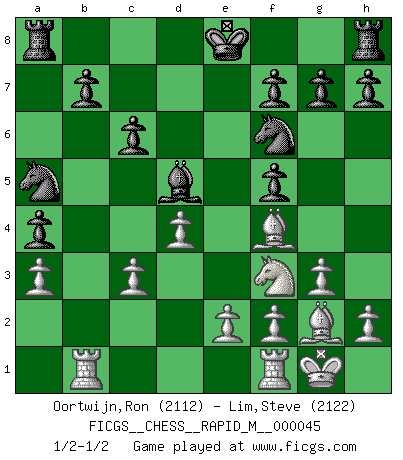 Last move : 1/2-1/2 2011 November 15 23:7:20 [Event "FICGS__CHESS__RAPID_M__000045"] [Site "FICGS"] [Date "2011.08.17"] [Round "1"] [White "Oortwijn,Ron"] [Black "Lim,Steve"] [Result "1/2-1/2"] [WhiteElo "2112"] [BlackElo "2122"] 1.d4 d5 2.c4 e6 3.Nf3 Nf6 4.g3 dxc4 5.Bg2 Bb4+ 6.Bd2 a5 7.Qc2 Nc6 8.Qxc4 Qd5 9.Qd3 Qf5 10.Qxf5 exf5 11.Nc3 Be6 12.a3 Bxc3 13.bxc3 Bd5 14.Rb1 a4 15.Bf4 Na5 16.O-O c6 1/2-1/2 Queen's gambit declined Kingside Castling by player White (move 16) This chess game ended in a draw. Follow this game move after move (download)The Pawns are the soul of the game. (Francois Andre Danican Philidor) Über Frauen: Chess is better. (Robert James Fischer) Ciertamente, de todas la drogas del mundo, el Ajedrez debe ser el mas placentero permamentemente. (Assiac) Il (Jacob Murray) ne joue pas pour le bon coup, mais pour le meilleur. (Eloi Relange) Players are not good because they find tactics, it is about the way to find the positions in which those tactics are hidden. (Luc-Olivier Leclerc)