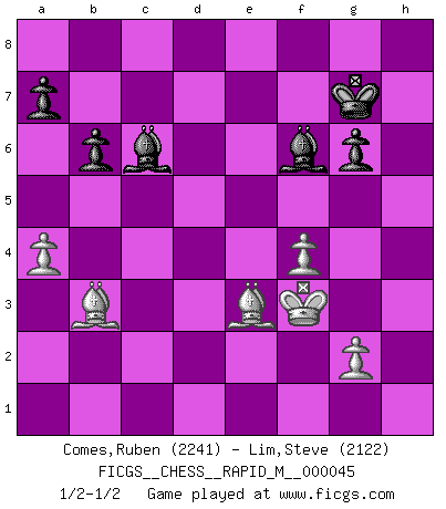 Last move : 1/2-1/2 2012 January 11 11:43:53 [Event "FICGS__CHESS__RAPID_M__000045"] [Site "FICGS"] [Date "2011.08.17"] [Round "1"] [White "Comes,Ruben"] [Black "Lim,Steve"] [Result "1/2-1/2"] [WhiteElo "2241"] [BlackElo "2122"] 1.e4 e6 2.c3 d5 3.e5 c5 4.d4 Nc6 5.Nf3 Qb6 6.a3 f6 7.Bd3 fxe5 8.dxe5 c4 9.Bc2 g6 10.O-O Bg7 11.Nbd2 Nge7 12.a4 Nxe5 13.Nxe5 Bxe5 14.Nf3 Bg7 15.Re1 O-O 16.h4 Bd7 17.h5 Rae8 18.hxg6 hxg6 19.Bg5 Qd6 20.Qd2 Nf5 21.Bf4 e5 22.Bh2 Bc6 23.Qe2 Qc5 24.Nxe5 d4 25.Qxc4+ Qxc4 26.Nxc4 dxc3 27.Rxe8 Rxe8 28.bxc3 Bxc3 29.Rc1 Bf6 30.Nd6 Nxd6 31.Bxd6 Kg7 32.Bc5 b6 33.Be3 Bb2 34.Rb1 Be5 35.Bb3 Rc8 36.f4 Bf6 37.Rc1 Bd7 38.Rxc8 Bxc8 39.Kf2 Bg4 40.Kg3 Bd7 41.Kf3 Bc6+ 1/2-1/2 French defense Kingside Castling by player White (move 10) Kingside Castling by player Black (move 15) This chess game ended in a draw. Follow this game move after move (download)I guess a certain amount of temperament is expected of Chess geniuses. (Ron Gross) Wie bekannt hörte Morphy 1859 auf, Schach zu spielen. Seine Enttäuschung galt nicht so sehr dem Schach, wie den Schachspielern. (Robert James Fischer) Siempre es mucho mejor sacrificar las piezas de tu oponente. (Savielly Tartakover) On croit qu'il y a plus de mauvais joueurs que de bons joueurs, c'est faux : Il y a autant de joueurs qui gagnent que de joueurs qui perdent. (Philippe Geluck) Now the reason the enlightened prince and the wise general conquer the enemy whenever they move and their achievements surpass those of ordinary men is foreknowledge. (Sun Tzu)