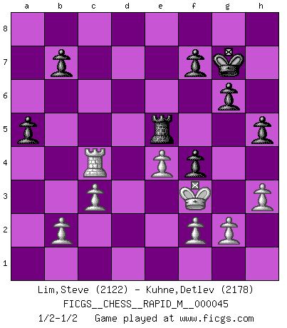 Last move : 1/2-1/2 2011 December 24 0:38:25 [Event "FICGS__CHESS__RAPID_M__000045"] [Site "FICGS"] [Date "2011.08.17"] [Round "1"] [White "Lim,Steve"] [Black "Kuhne,Detlev"] [Result "1/2-1/2"] [WhiteElo "2122"] [BlackElo "2178"] 1.e4 c5 2.Nf3 d6 3.d4 cxd4 4.Nxd4 Nf6 5.Nc3 a6 6.h3 e5 7.Nde2 h5 8.Bg5 Be6 9.Bxf6 Qxf6 10.Nd5 Qd8 11.Nec3 g6 12.Bc4 Bh6 13.O-O Nc6 14.Bb3 O-O 15.Qd3 Rc8 16.Ne3 Nd4 17.Rad1 Qh4 18.Ncd5 Rc5 19.c3 Nxb3 20.axb3 Bxe3 21.b4 Bxd5 22.bxc5 Bb3 23.Qxe3 Bxd1 24.Rxd1 dxc5 25.Rd5 Qf4 26.Qxf4 exf4 27.Rxc5 Re8 28.Rc4 a5 29.Kf1 Re5 30.Ke2 Kg7 31.Kf3 1/2-1/2 Sicilian : Najdorf, Adams attack Kingside Castling by player White (move 13) Kingside Castling by player Black (move 14) This chess game ended in a draw. Follow this game move after move (download)There are tough players and nice guys, and I'm a tough player. (Bobby Fischer) Das typische an einem Großmeister ist, daß er eine gewonnene Position schnell und schmerzlos gewinnt. (Irving Chernev) No es una movida, aún la mejor movida que tu debas buscar, sino un plan comprensible. (Eugene Znosko-Borovsky) A chaque perte on perd un peu de soi. (Joël Lautier) I have opinions of my own - strong opinions - but I don't always agree with them. (George Bush)