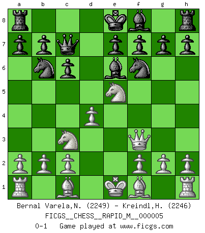Last move : 0-1 2007 February 22 17:33:6 [Event "FICGS__CHESS__RAPID_M__000005"] [Site "FICGS"] [Date "2007.01.01"] [Round "1"] [White "Bernal Varela,Nelson"] [Black "Kreindl,Helmut"] [Result "0-1"] [WhiteElo "2249"] [BlackElo "2246"] 1.e4 d5 2.exd5 Qxd5 3.Nc3 Qd6 4.d4 Nf6 5.Nf3 c6 6.Ne5 Nbd7 7.Nc4 Qc7 8.Qf3 Nb6 9.Ne5 Be6 0-1 This chess game has been lost on time (started : 2007.01.01 23:9:0) Scandinavian : Pytel-Wade variation Player Black won this chess game. Follow this game move after move (download)Methodical thinking is of more use in Chess than inspiration. (C. J. S. Purdy) Die Auseinandersetzung mit Karpow war politisch geprägt. Er stand für das kommunistische System, wurde von dessen Repräsentanten gehätschelt. Ich war der Oppositionelle. Jeder Schachweltmeister spiegelt auch die gesellschaftlichen Verhältnisse wider. Kramnik steht für die Börsen-Generation des Neuen Markts, ideologiefrei, zahlenfixiert. (Garry Kasparov) Todos los jugadores de Ajedrez deberían tener un pasatiempo. (Savielly Tartakower) Les Echecs sont et restent toujours un combat, un combat intégral comme la boxe, la lutte ou un autre sport, et où il doit y avoir un vainqueur et un vaincu. (Joseph Emil Diemer) Depression is just anger without enthusiasm. (Unknown)