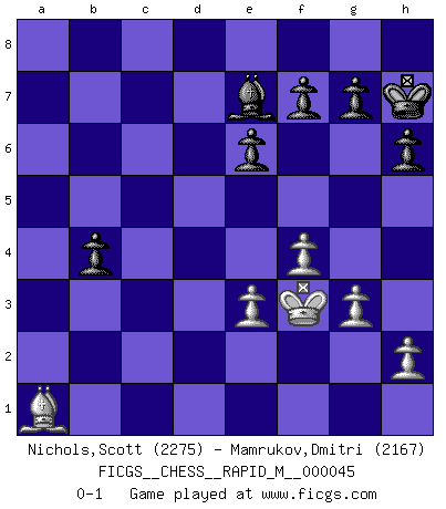 Last move : 0-1 2011 September 5 0:9:14 [Event "FICGS__CHESS__RAPID_M__000045"] [Site "FICGS"] [Date "2011.08.17"] [Round "1"] [White "Nichols,Scott"] [Black "Mamrukov,Dmitri"] [Result "0-1"] [WhiteElo "2275"] [BlackElo "2167"] 1.d4 Nf6 2.c4 e6 3.g3 d5 4.Nf3 Be7 5.Bg2 O-O 6.O-O dxc4 7.Qc2 a6 8.Rd1 b5 9.Ng5 c6 10.b3 cxb3 11.axb3 h6 12.Nf3 Bb7 13.Ne5 Qb6 14.Bb2 Rc8 15.Nc3 Nbd7 16.Nxd7 Nxd7 17.Qd3 Rab8 18.Ne4 c5 19.dxc5 Nxc5 20.Qe3 Bxe4 21.Bxe4 Nxe4 22.Qxe4 Rd8 23.Rdc1 Rbc8 24.e3 Rxc1+ 25.Rxc1 a5 26.Bd4 Qd6 27.Kg2 Qb8 28.Ra1 Qa8 29.Qxa8 Rxa8 30.Bb2 Kh7 31.f4 a4 32.bxa4 Rxa4 33.Kf3 Rxa1 34.Bxa1 b4 0-1 Catalan Opening Kingside Castling by player Black (move 5) Kingside Castling by player White (move 6) Player Black won this chess game. Follow this game move after move (download)The laws of Chess do not permit a free choice: you have to move whether you like it or not. (Emanuel Lasker) Die Auseinandersetzung mit Karpow war politisch geprägt. Er stand für das kommunistische System, wurde von dessen Repräsentanten gehätschelt. Ich war der Oppositionelle. Jeder Schachweltmeister spiegelt auch die gesellschaftlichen Verhältnisse wider. Kramnik steht für die Börsen-Generation des Neuen Markts, ideologiefrei, zahlenfixiert. (Garry Kasparov) No puedes jugar al Ajedrez si eres de corazón noble. (Proverbio Francés) Soyez une menace à chaque fois que vous vous asseyez pour jouer. (Ken Smith) As the days dwindle down... to a precious few. (Maxwell Anderson)