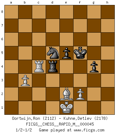 Last move : 1/2-1/2 2011 November 22 9:36:37 [Event "FICGS__CHESS__RAPID_M__000045"] [Site "FICGS"] [Date "2011.08.17"] [Round "1"] [White "Oortwijn,Ron"] [Black "Kuhne,Detlev"] [Result "1/2-1/2"] [WhiteElo "2112"] [BlackElo "2178"] 1.d4 d5 2.c4 c6 3.Nc3 Nf6 4.Nf3 e6 5.Bg5 h6 6.Bh4 dxc4 7.e4 g5 8.Bg3 b5 9.Be2 Bb7 10.O-O Nbd7 11.Ne5 Nxe5 12.Bxe5 Be7 13.b3 cxb3 14.axb3 O-O 15.h4 a5 16.Bd3 Ne8 17.hxg5 hxg5 18.d5 f6 19.Bd4 b4 20.e5 c5 21.Qh5 f5 22.Qg6+ Ng7 23.d6 Bxd6 24.exd6 cxd4 25.Nb5 Qf6 26.Qxf6 Rxf6 27.Bc4 Kf7 28.Rfd1 g4 29.d7 Ke7 30.Nxd4 Rh8 31.Rxa5 Rfh6 32.d8Q+ Rxd8 33.Ra7 Kf6 34.Rxb7 Rdh8 35.Kf1 Rh1+ 36.Ke2 Rxd1 37.Kxd1 Rd8 38.Ke2 Rxd4 39.Rxb4 Nh5 40.g3 f4 41.gxf4 Re4+ 42.Kf1 Nxf4 43.Rb5 Rd4 44.Be2 Nd5 45.Rc5 Kg5 46.Rc8 Kf4 47.Rc4 e5 48.Ke1 Kf5 1/2-1/2 QGD Slav defense Kingside Castling by player White (move 10) Kingside Castling by player Black (move 14) Promotion Queen by player White (move 32) 10 pieces endgame at move 42 : White KRBPP , Black KRNPP WHITE : King + 1 Rook 1 Bishop 2 Pawns BLACK : King + 1 Rook 1 Knight 2 Pawns This chess game ended in a draw. Follow this game move after move (download)Those who say they understand Chess, understand nothing. (Robert Hubner) Ich bin stolz ein Bulgare zu sein. (Veselin Topalov) El Ajedrez por encima de todo... ¡es una pelea!. (Emanuel Lasker) On est toujours la mazette de quelqu'un d'autre. (Anonyme) There's always a bigger fish. (Qui-Gon Jinn in Star Wars ep.1)
