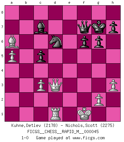 Last move : 1-0 2011 September 30 2:51:55 [Event "FICGS__CHESS__RAPID_M__000045"] [Site "FICGS"] [Date "2011.08.17"] [Round "1"] [White "Kuhne,Detlev"] [Black "Nichols,Scott"] [Result "1-0"] [WhiteElo "2178"] [BlackElo "2275"] 1.e4 d6 2.d4 Nf6 3.Nc3 g6 4.f4 Bg7 5.Nf3 O-O 6.Bd3 Na6 7.O-O c5 8.d5 Bg4 9.Bc4 Nh5 10.h3 Bxf3 11.Qxf3 Nb4 12.Rf2 Rb8 13.Be3 Qa5 14.e5 dxe5 15.fxe5 Bxe5 16.a3 Na6 17.Bh6 Ng7 18.Ne4 Qa4 19.Bb3 Qd7 20.d6 Kh8 21.Ng5 f6 22.Bxg7+ Kxg7 23.Ne6+ Kh8 24.Nxf8 Rxf8 25.dxe7 Qxe7 26.c3 b5 27.a4 b4 28.Bc4 bxc3 29.bxc3 Nc7 30.Rb1 Rd8 31.a5 a6 32.Re2 Kg7 33.Re3 Rd7 34.Rd3 Rxd3 35.Qxd3 Ne8 36.Bxa6 Bc7 37.Kf1 Nd6 38.Re1 Qf7 39.Rd1 1-0 Pirc : Austrian attack, 6.Bd3 Kingside Castling by player Black (move 5) Kingside Castling by player White (move 7) Player White won this chess game. Follow this game move after move (download)Weak points or holes in the opponent's position must be occupied by pieces not Pawns. (Siegbert Tarrasch) Gewinnen beim Schach fördert das Selbstvertrauen. Beim Sex spüre ich sowas nicht... (Garry Kasparov) Un jugador que trata de regresar una movida en el Ajedrez es un futuro carterista. (Richard Fenton) Le thème de l'attaque double intervient d'une manière ou d'une autre dans l'immense majorité des combinaisons. (Youri Averbakh) Imagination is more important than knowledge. Knowledge is limited. Imagination encircles the world. (Albert Einstein)