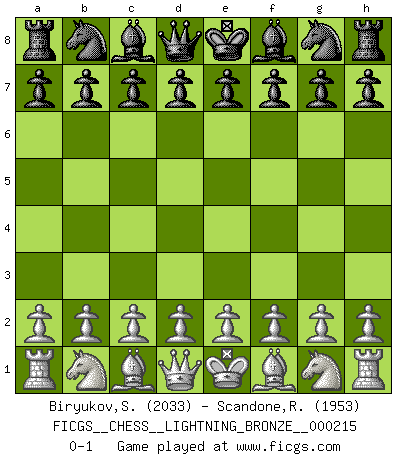 Last move : 0-1 2011 August 17 21:37:22 [Event "FICGS__CHESS__LIGHTNING_BRONZE__000215"] [Site "FICGS"] [Date "2011.08.17"] [Round "1"] [White "Biryukov,Sergey"] [Black "Scandone,Raffaele"] [Result "0-1"] [WhiteElo "2033"] [BlackElo "1953"] 0-1 This chess game has been lost on time (started : 2011.08.17 17:58:39) Player Black won this chess game. Follow this game move after move (download)Many have become Chess Masters, no one has become the Master of Chess. (Siegbert Tarrasch) Stelle das Brett so, daß die Sonne in die Augen deines Gegners scheint. (Ruy López) En la perfecta combinación de Ajedrez como en una historia corta de primera clase, toda la trama y contra trama deberá conducir hacia un final sorprendente, el interes no es mitigado hasta el último momento. (Yates and Winter) D'abord les bases : Jouez et étudiez, puis étudiez et jouez, ensuite jouez et étudiez, puis étudiez et jouez. Deuxièmement : Donnez toujours le meilleur de vous-même ! (Ken Smith) When you don't know what to do, walk fast and look worried. (Anonymous)