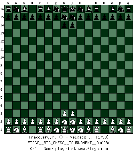 Last move : 0-1 2011 September 18 10:30:46 [Event "FICGS__BIG_CHESS__TOURNAMENT__000080"] [Site "FICGS"] [Date "2011.08.18"] [Round "1"] [White "Krakovsky,Peter"] [Black "Velasco,Jose Maria"] [Result "0-1"] [WhiteElo ""] [BlackElo "1798"] 0-1 This big chess game has been lost on time (started : 2011.08.18 23:11:13) Follow this game move after move (download)A Chess game is divided into three stages: the first, when you hope you have the advantage, the second when you believe you have an advantage, and the third... when you know you're going to lose ! (Savielly Tartakower) Man braucht nicht immer den besten Zug zu spielen: Ein Zug muß aktiv, unternehmungslustig, korrekt und schön sein. (David Bronstein) El Ajedrez, como la música, como el amor, tiene el poder de hacer feliz a la gente. (Siegbert Tarrasch) Toutes les manuvres exécutées sur une colonne ouverte ont pour but ultime l'intrusion définitive sur la septième ou la huitième rangée, en plein cur de la position ennemie. (Aaron Nimzovitch) Shallow men believe in luck. Strong men belive in cause and effect. (Ralph Waldo Emerson)