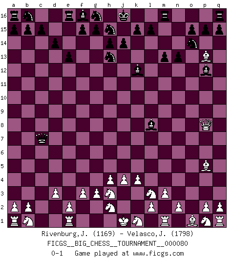 Last move : 0-1 2011 October 10 11:42:49 [Event "FICGS__BIG_CHESS__TOURNAMENT__000080"] [Site "FICGS"] [Date "2011.08.18"] [Round "1"] [White "Rivenburg,John"] [Black "Velasco,Jose Maria"] [Result "0-1"] [WhiteElo "1169"] [BlackElo "1798"] 1.j3-j4 j15-h13 2.h3-h4 h16-o10 3.g2-g3 o10-o2 4.m2-m3 o2-c13 5.k2-k3 c13-c2 6.f1-g2 c2-c14 7.g2-a8 m15-m13 8.a8-h15 k16-h15 9.k3-k4 n15-n13 10.f2-f3 o16-k12 11.j2-l3 l16-p12 12.h1-p8 p16-o14 13.g1-h3 e15-e13 14.d2-d3 d15-d14 15.l1-p5 c16-l8 16.c1-p13 c14-c7 0-1 This big chess game has been lost on time (started : 2011.08.18 23:11:13) Follow this game move after move (download)Chess is above all, a fight ! (Emanuel Lasker) Woher wissen wir, daß der Neanderthaler Blindschach gespielt hat? -- Bei Ausgrabungen wurden keine Schachbretter und Figuren gefunden. (Anonymous) Durante una competencia de Ajedrez, un Maestro de Ajedrez deberá ser una combinación de presa de caza y un Monge. (Alexander Alekhine) Le génie consiste à savoir transgresser les règles au moment opportun. (Teichmann) There is no vagueness without wind. (Chinese proverb)