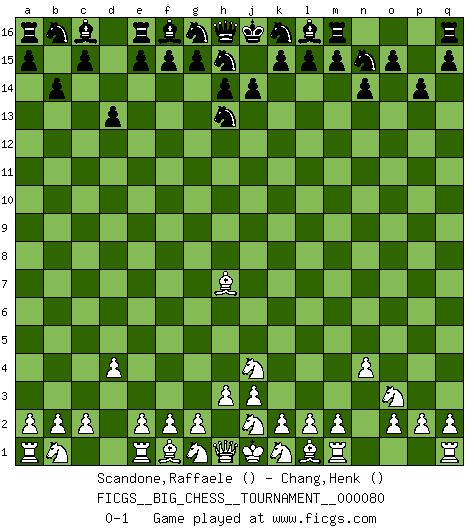 Last move : 0-1 2011 October 8 23:39:54 [Event "FICGS__BIG_CHESS__TOURNAMENT__000080"] [Site "FICGS"] [Date "2011.08.18"] [Round "1"] [White "Scandone,Raffaele"] [Black "Chang,Henk"] [Result "0-1"] [WhiteElo ""] [BlackElo ""] 1.p1-o3 j15-h13 2.d2-d4 n15-n14 3.n2-n4 p15-p14 4.c1-p13 o16-n15 5.p13-n15 p16-n15 6.h2-j4 d15-d13 7.o1-h7 b15-b14 0-1 This big chess game has been lost on time (started : 2011.08.18 23:11:13) Follow this game move after move (download)One of these modest little moves may be more embarrassing to your opponent than the biggest threat. (Siegbert Tarrasch) Schach ist mein Leben, meine Leidenschaft, was ich gelernt habe und seit meinem 14. Lebensjahr profimässig praktiziere. Darauf zu verzichten, würde mir sehr schwer fallen. (Viktor Kortschnoi) Cuando tu no sabes absolutamente que mas hacer, es tiempo de entrar en pánico. (John van der Wiel) Il vaut mieux sacrifier les pièces de l'adversaire. (Xavier Tartacover) Indecision is the key to flexibility. (Unknown)